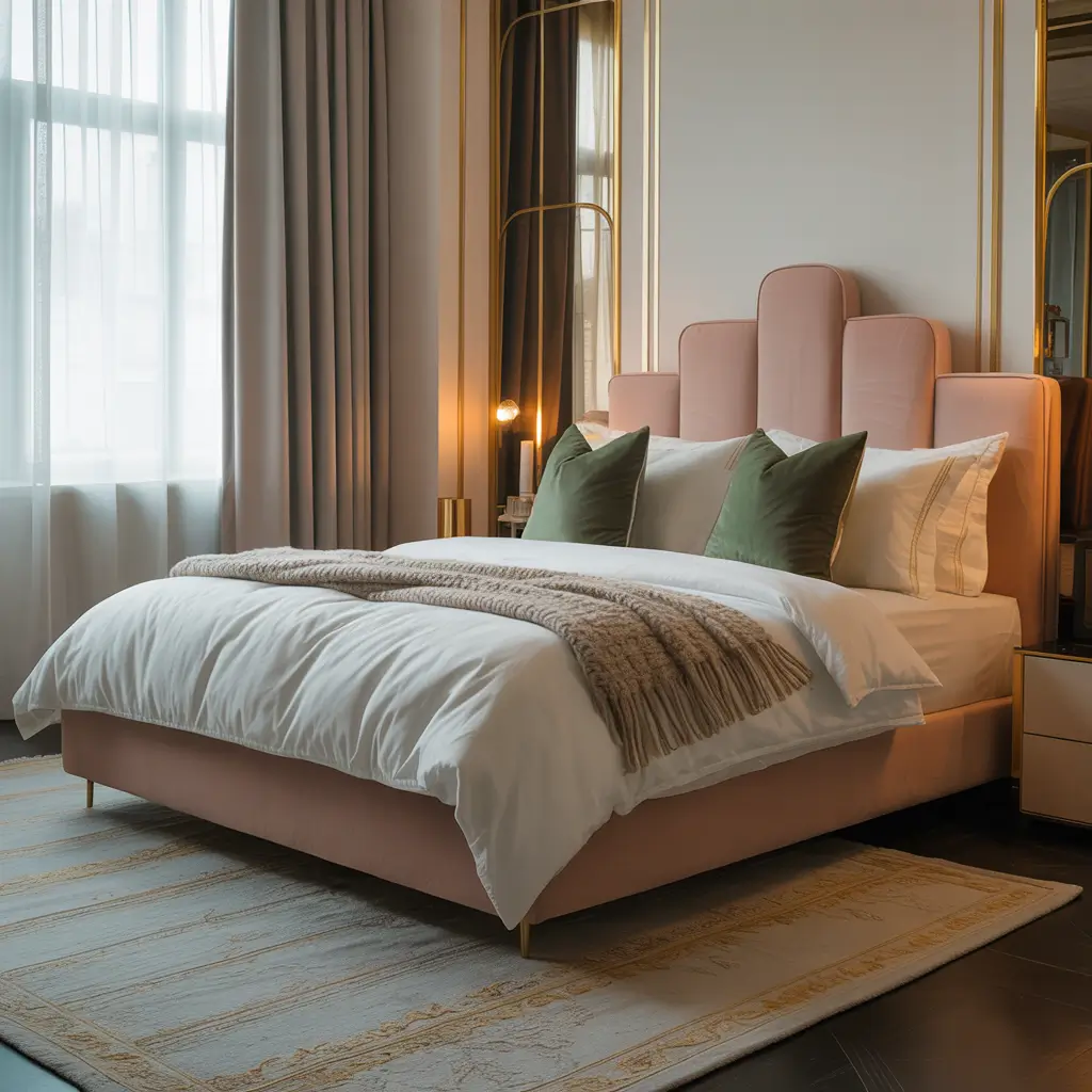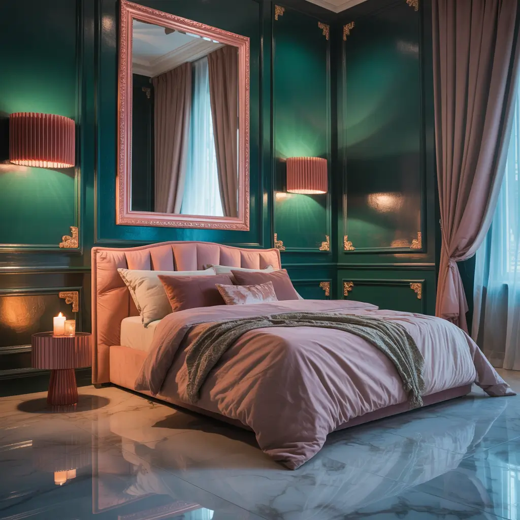 Flip the script entirely by choosing pink furniture as your foundation and green as your luxury accent. This unexpected approach makes your bedroom feel custom and intentional rather than catalog-copied.