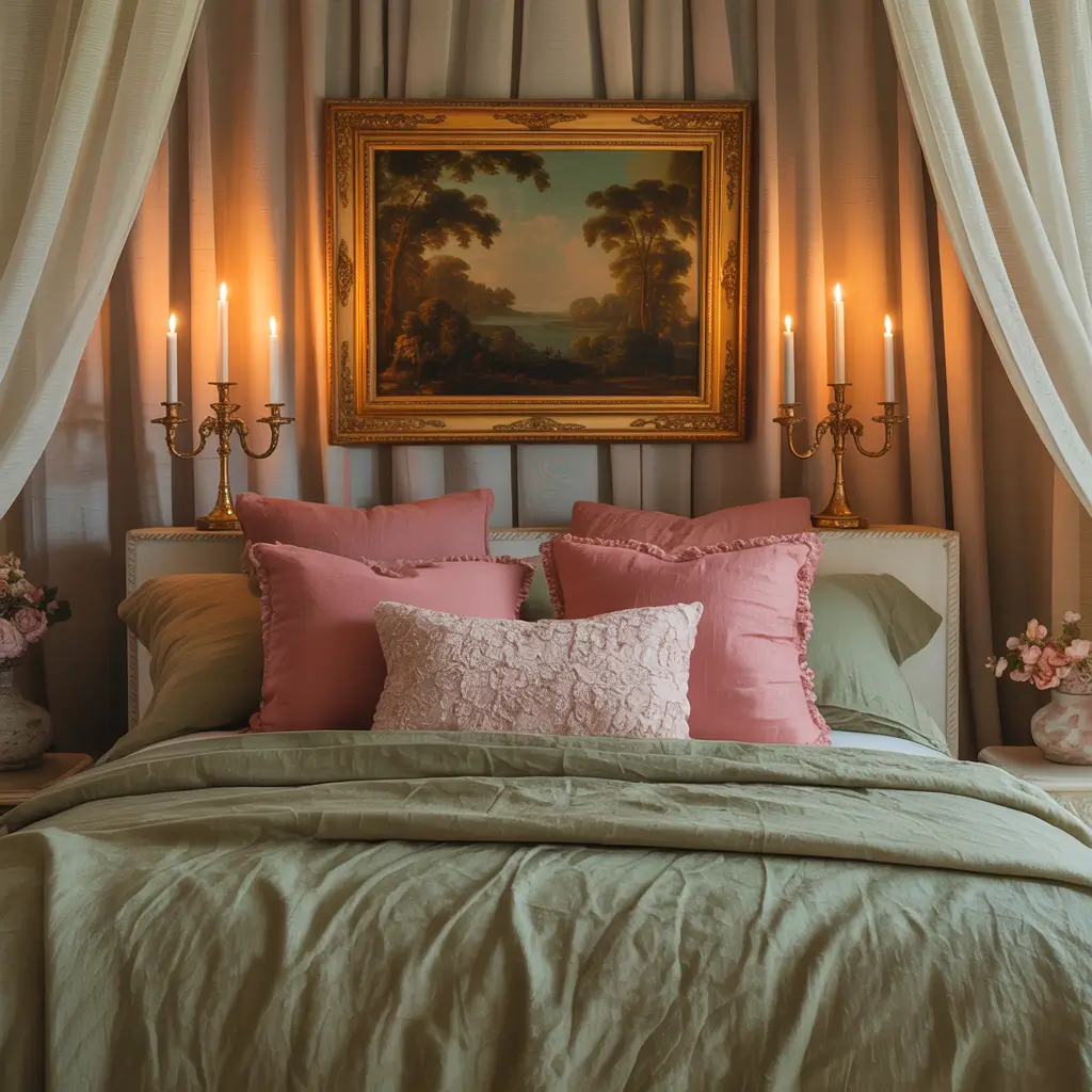 I achieved this look by layering different shades and textures of both colors. Rose pink sheets under a moss green duvet, layered with throws and pillows in various tones of both colors. The depth created by layering makes the room feel expensive and intentional.
