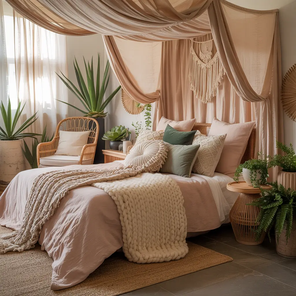 My sister created this look using sheer blush curtains on a simple metal canopy frame, then surrounded it with potted plants, green macramé wall hangings, and emerald throw pillows. The effect is dreamy without being juvenile, boho without being chaotic.