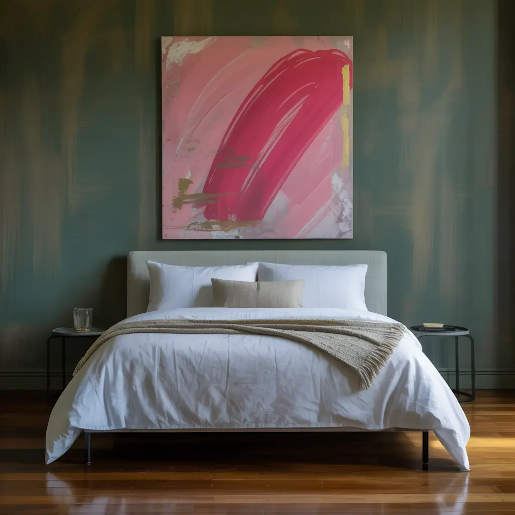 Art lovers, this one’s for you. Bold pink artwork against textured green walls creates a gallery-worthy bedroom that feels both personal and sophisticated. Why should living rooms have all the art fun?