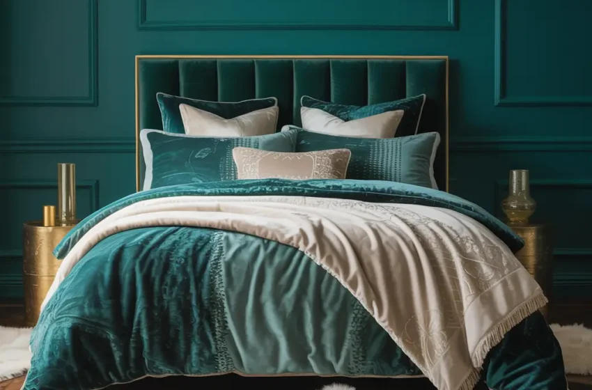 The deep, jewel-toned green provides drama while rose gold metallic accents add warmth and sparkle. Think velvet emerald curtains, rose gold mirror frames, and crystal light fixtures. It’s opulent without being gaudy, glamorous without trying too hard.