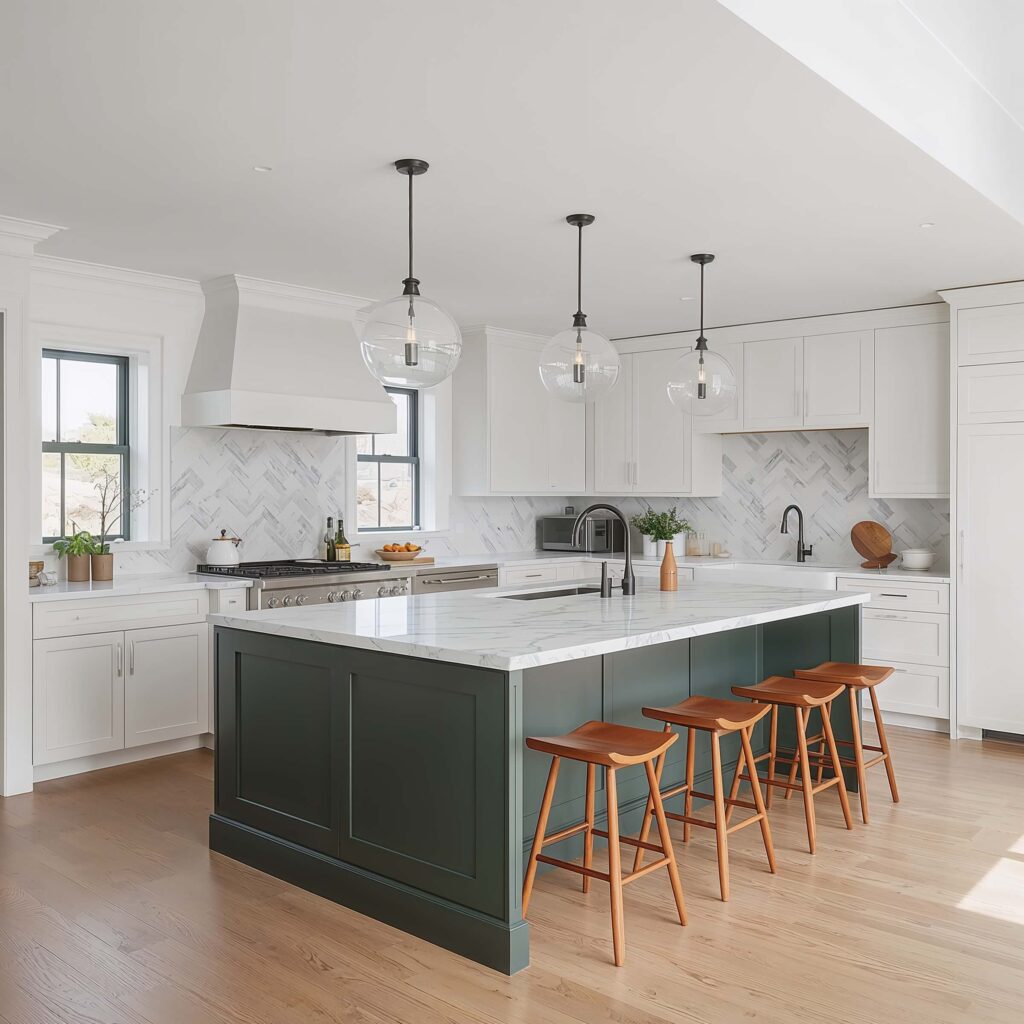 Want to know what’s having a moment right now? The statement island trend, and dark green is leading the charge. Picture this: pristine white cabinets everywhere, then BAM – a gorgeous forest green or deep emerald island commanding attention like a boss.