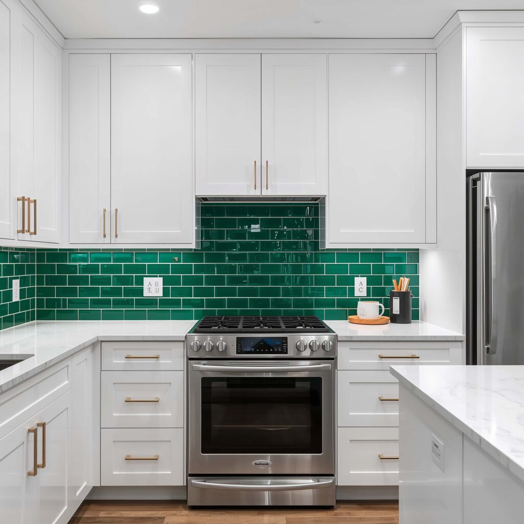 I installed emerald green subway tiles in my last apartment (yes, I got permission from my landlord first), and let me tell you, it transformed the entire space. White cabinets can sometimes feel a bit… vanilla? But add a green backsplash, and suddenly you’ve got personality for days.