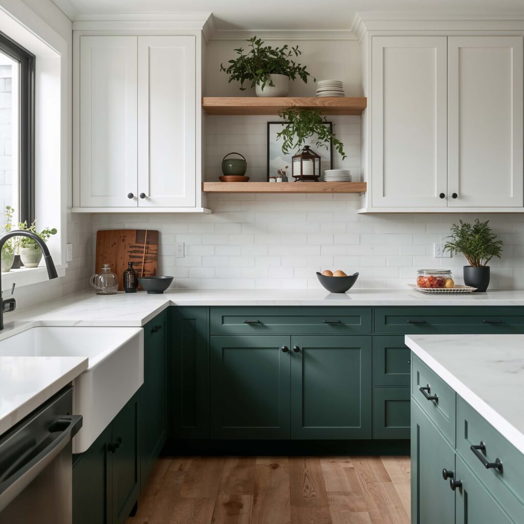 We touched on two-tone earlier, but green lowers with white uppers deserves its own moment. This specific combination has become the go-to for designers who want to add color without overwhelming a space.
