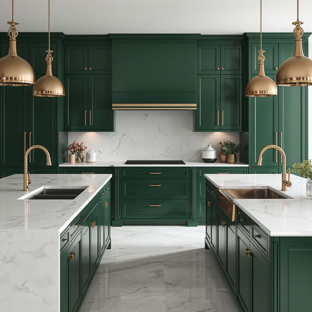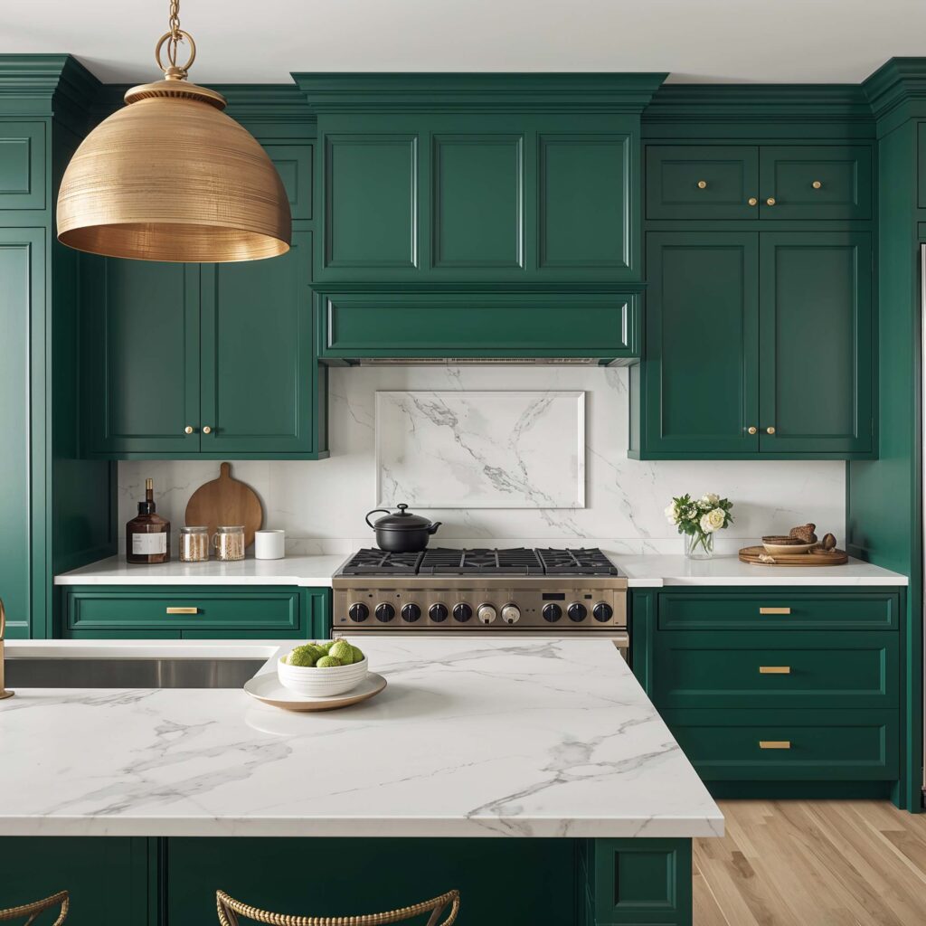 Emerald Green Cabinets with White Marble