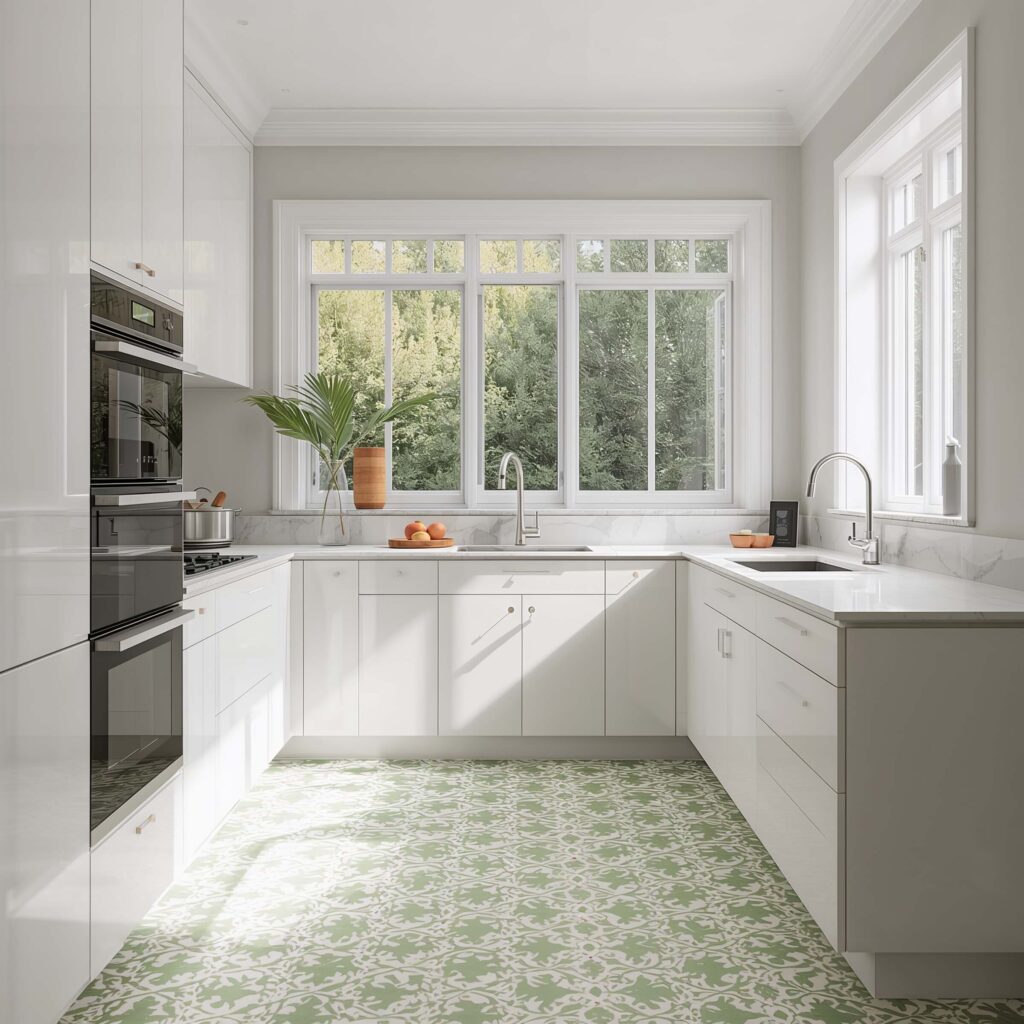 White Kitchen with Green Tile Flooring