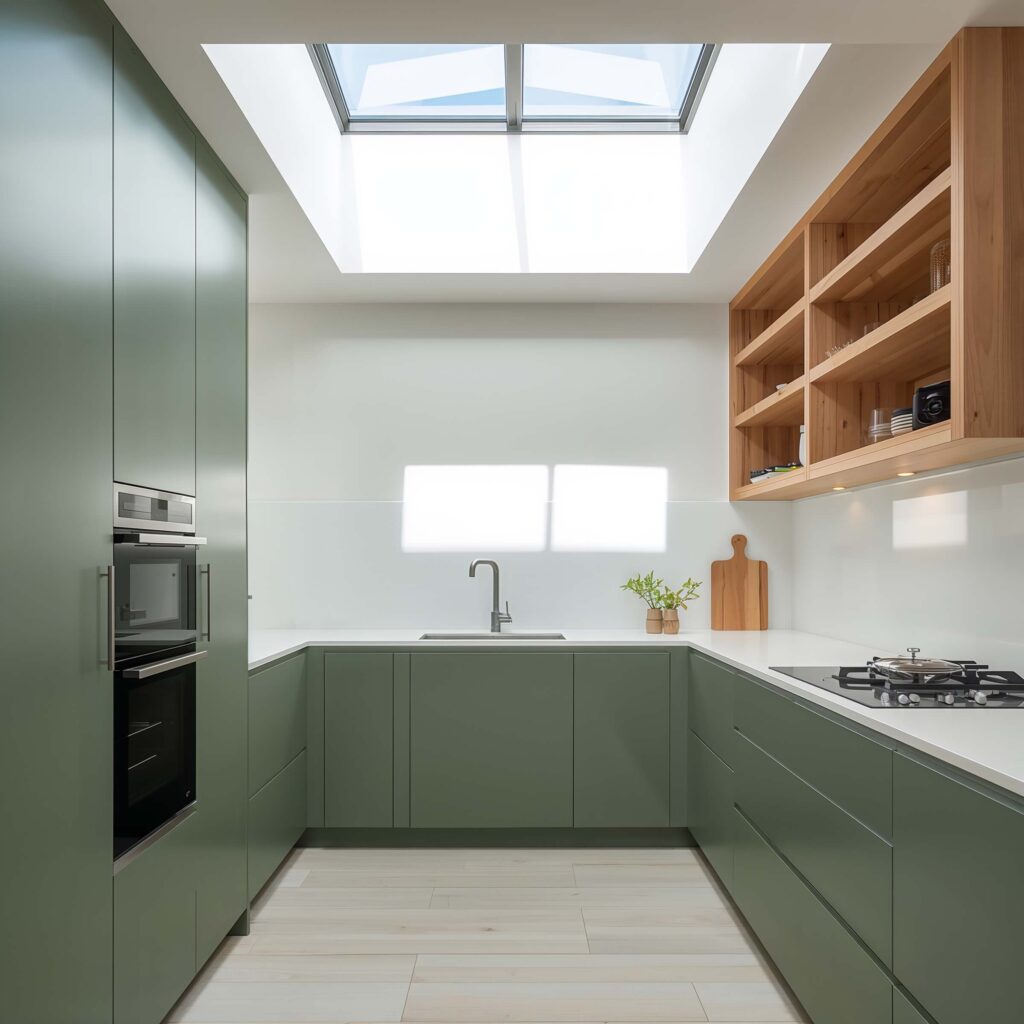 The trick here is choosing the right shade of green for your walls. Too dark and your kitchen feels like a cave. Too bright and you’ll feel like you’re cooking inside a lime. The sweet spot? Mid-tone greens that complement your lighting.