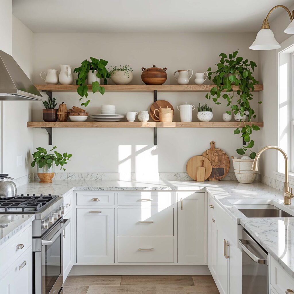 Here’s a budget-friendly option that packs a punch: keeping everything white but adding green open shelving. It’s like the accent wall of kitchen storage – minimal commitment, maximum impact.