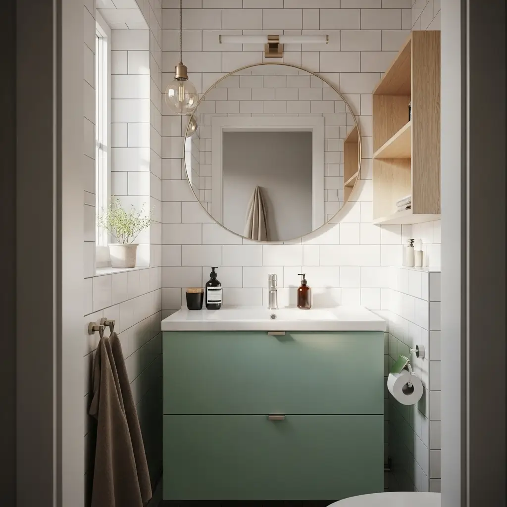 My friend’s tiny bathroom felt cramped and dark until she painted her 24-inch vanity mint green. The light, cool tone actually makes the space feel larger while adding personality. She paired it with white penny tiles and chrome fixtures for a fresh, vintage-inspired look.