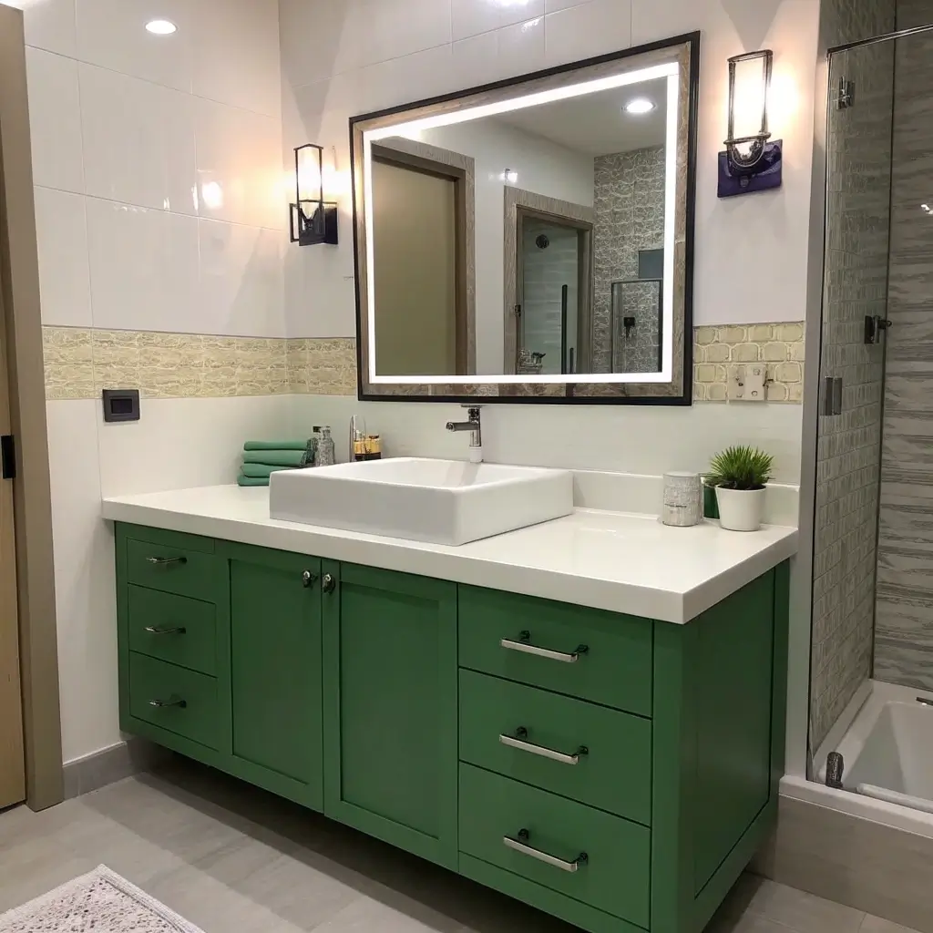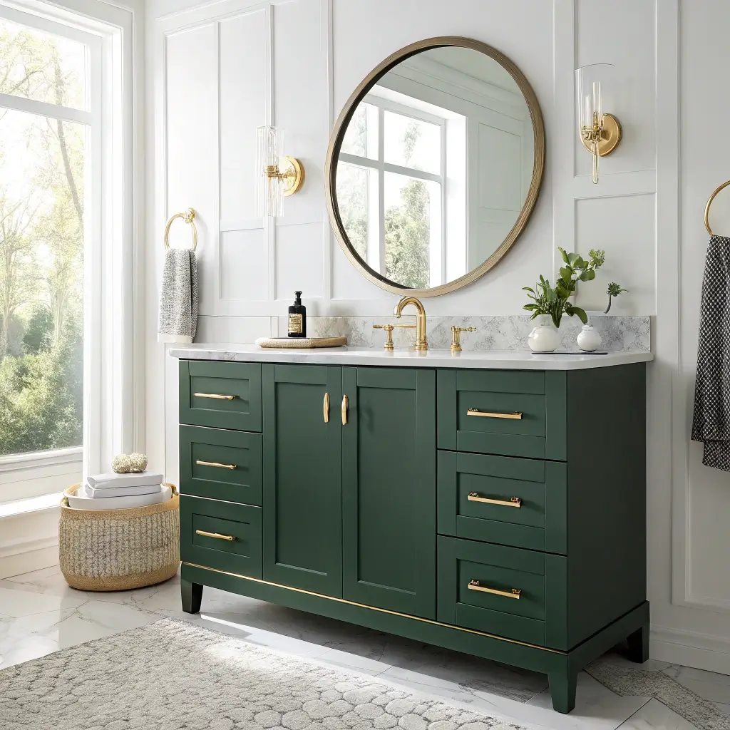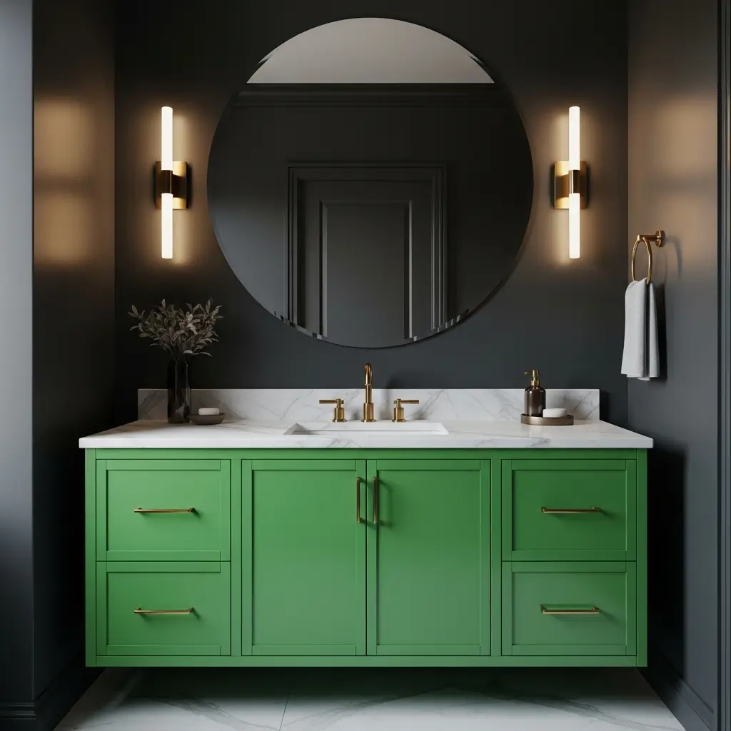 I’ve seen stunning vanities with green base cabinets and white upper drawers, or vice versa. The combination prevents color overwhelm while creating visual interest that solid colors can’t match. It’s like having your cake and eating it too (but make it bathroom furniture).