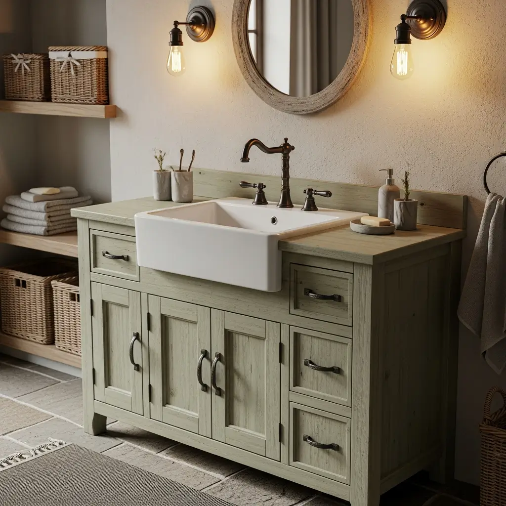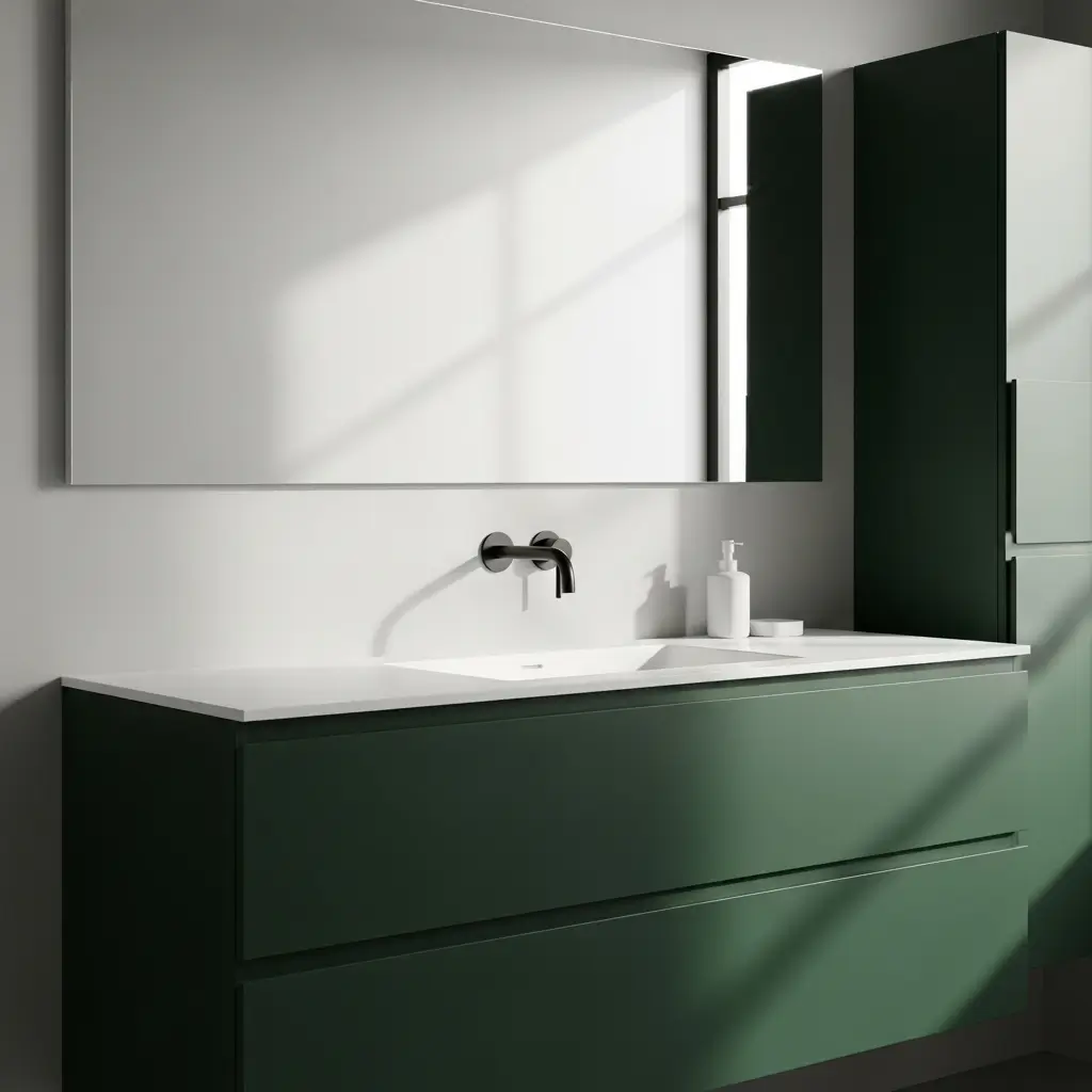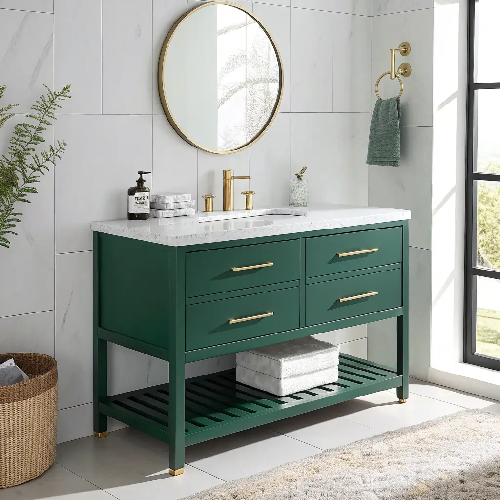 I’ve seen stunning vanities with green base cabinets and white upper drawers, or vice versa. The combination prevents color overwhelm while creating visual interest that solid colors can’t match. It’s like having your cake and eating it too (but make it bathroom furniture).