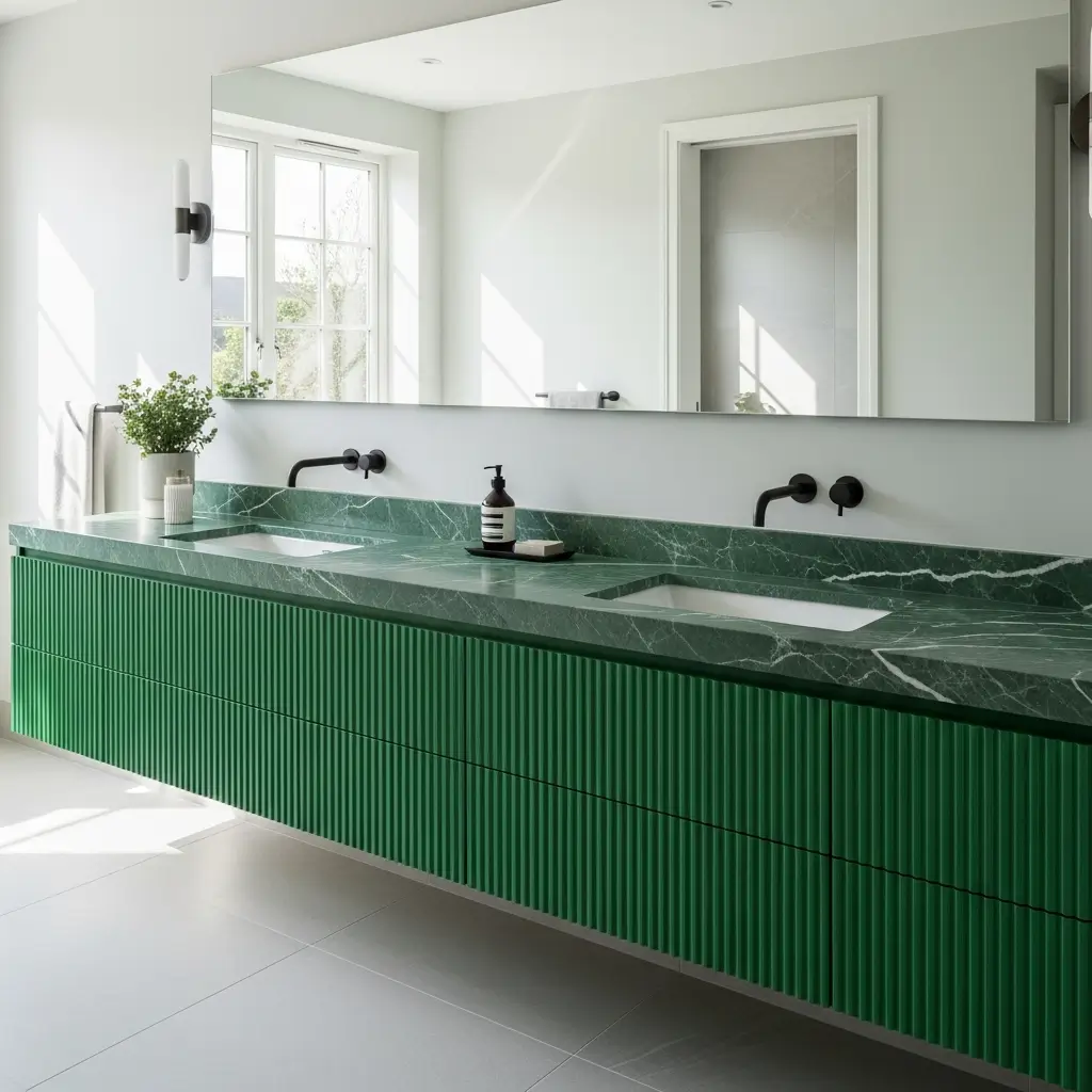 Why stop at a green vanity when you can have green marble tops too? Natural stones like verde green marble or emerald quartzite bring organic green patterns that no paint can replicate.