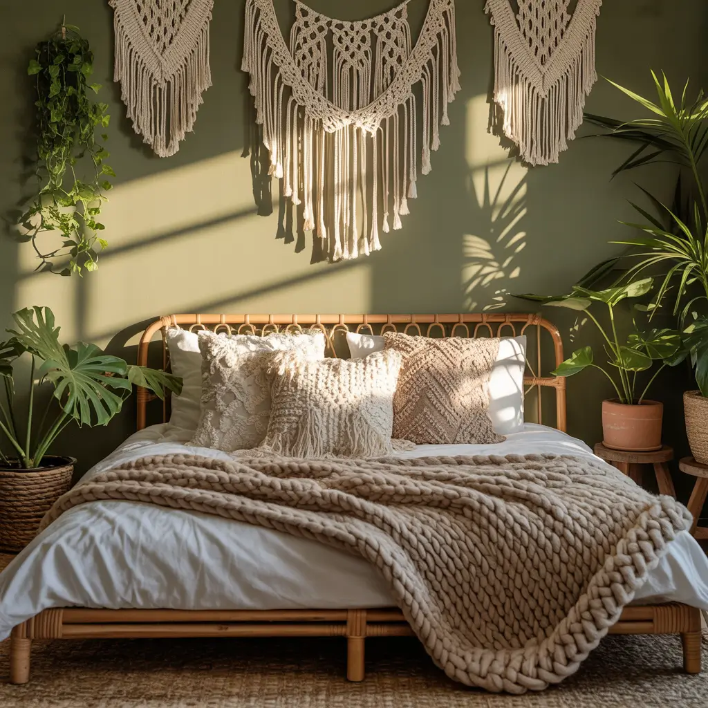 My guest room rocks the olive boho vibe with walls in a warm olive tone paired with macramé wall hangings, rattan furniture, and approximately 47 throw pillows (okay, maybe 12). The olive prevents the space from feeling too busy despite all the patterns and textures.