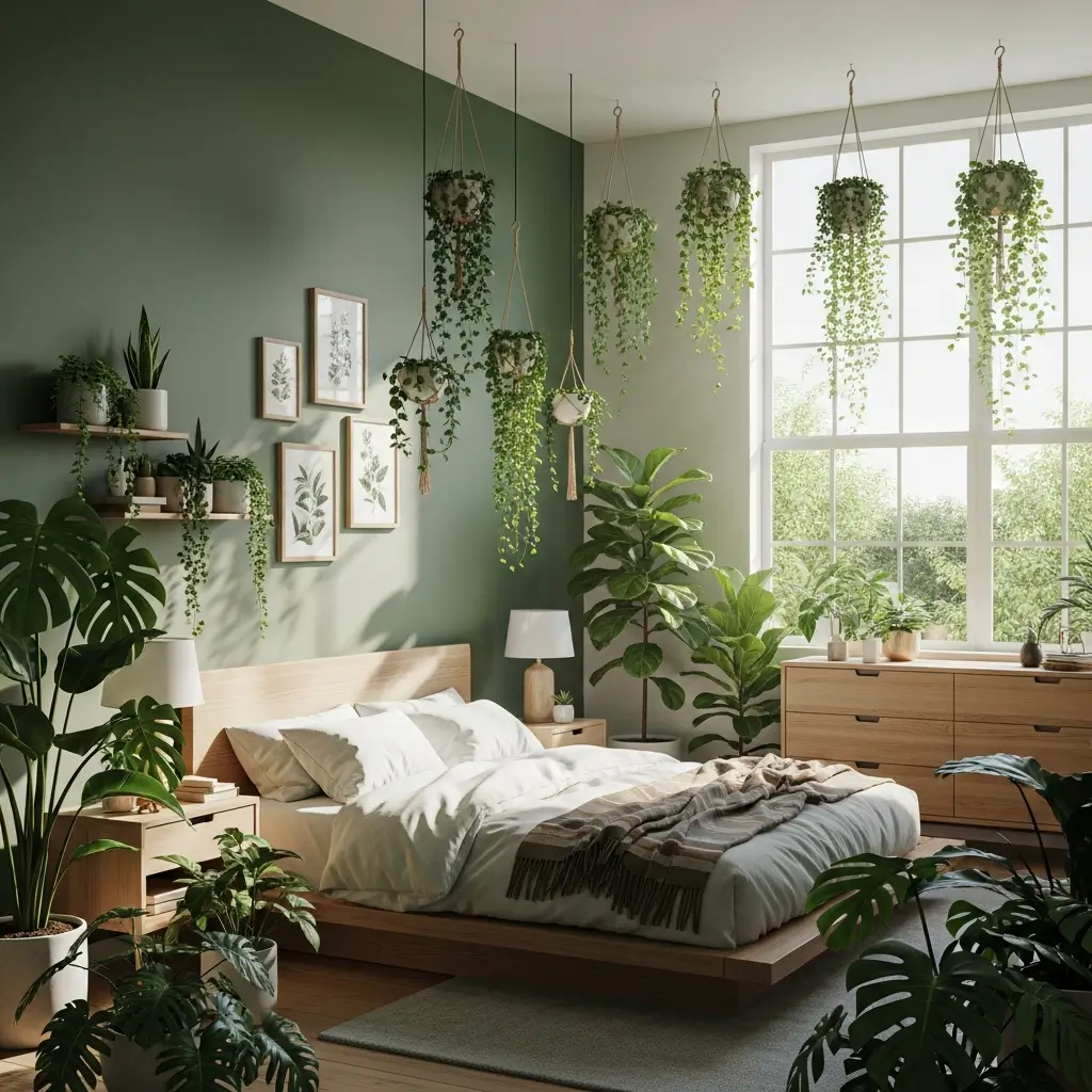 Can’t decide on a green paint color? Forget paint and create an urban jungle bedroom with actual greenery instead.
