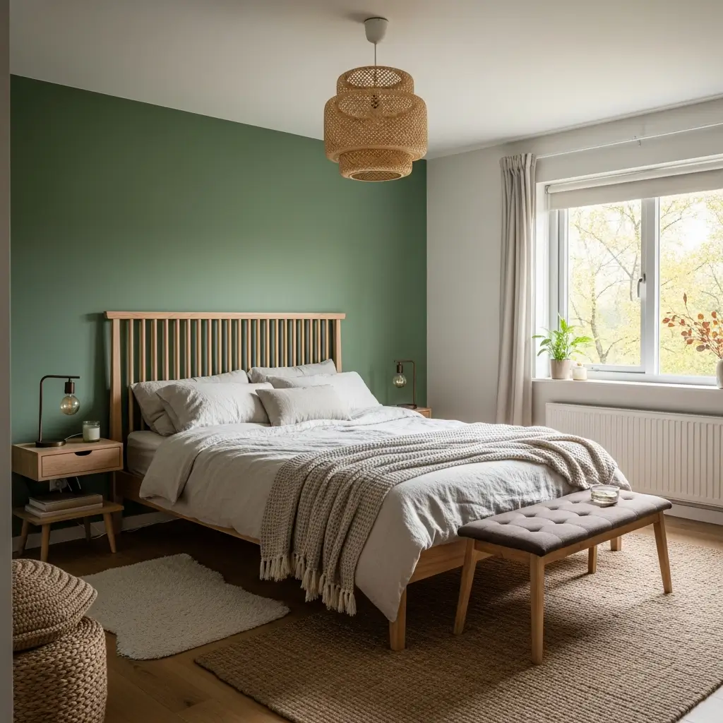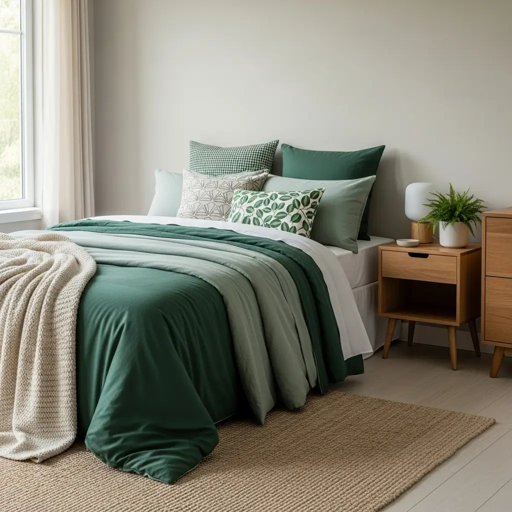 Sometimes paint isn’t an option (looking at you, renters). Green textiles transform a bedroom without touching the walls.