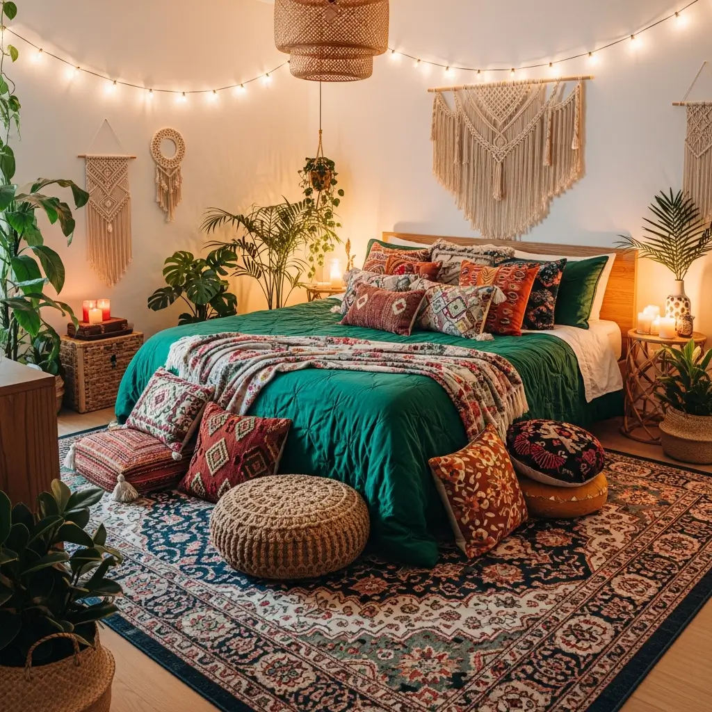 The trick is letting the emerald comforter be the star while everything else plays supporting roles. Too many competing colors and even boho style looks confused.