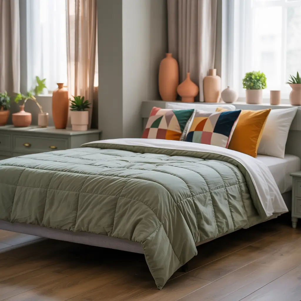 Solid green comforters provide the perfect canvas for pattern play through throw pillows. This approach lets you experiment with trends without committing to patterned bedding that you might hate in six months. I change my pillow patterns seasonally, and my olive comforter makes every combination work.