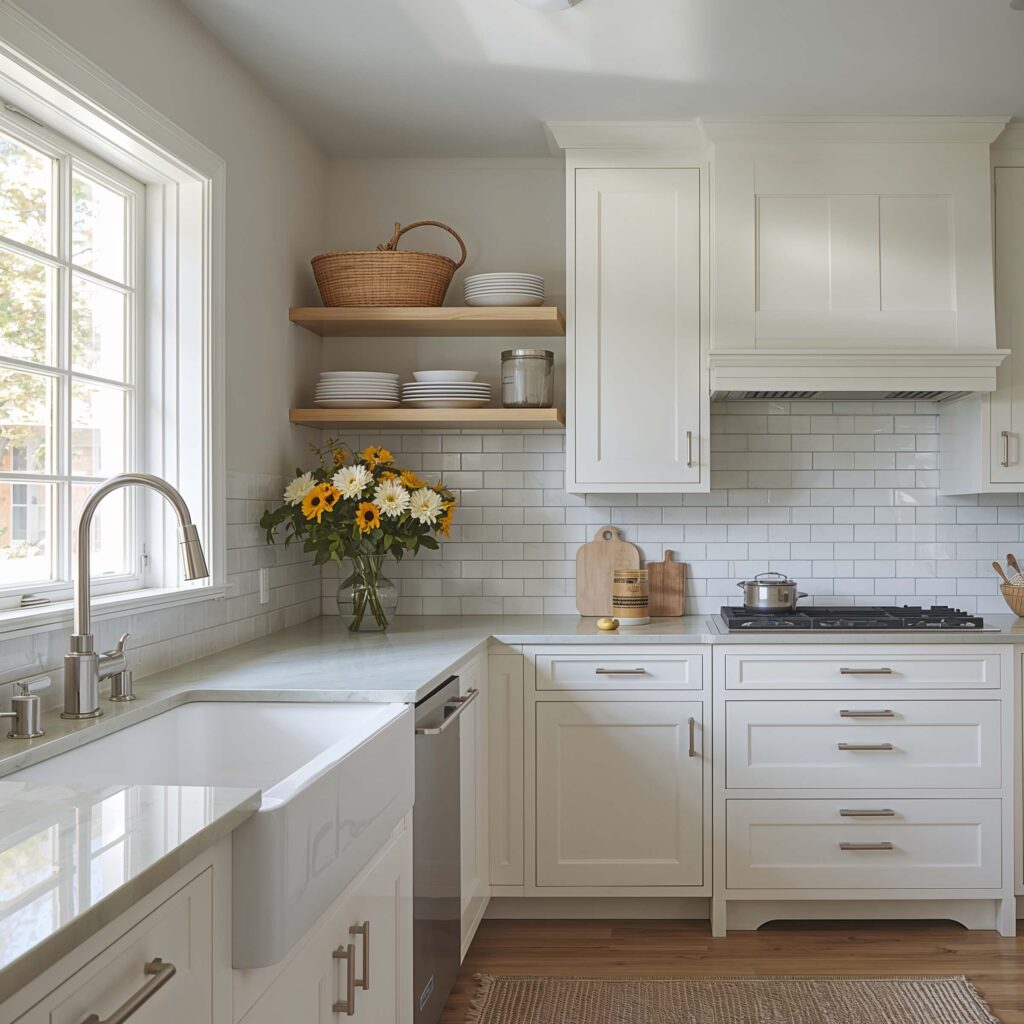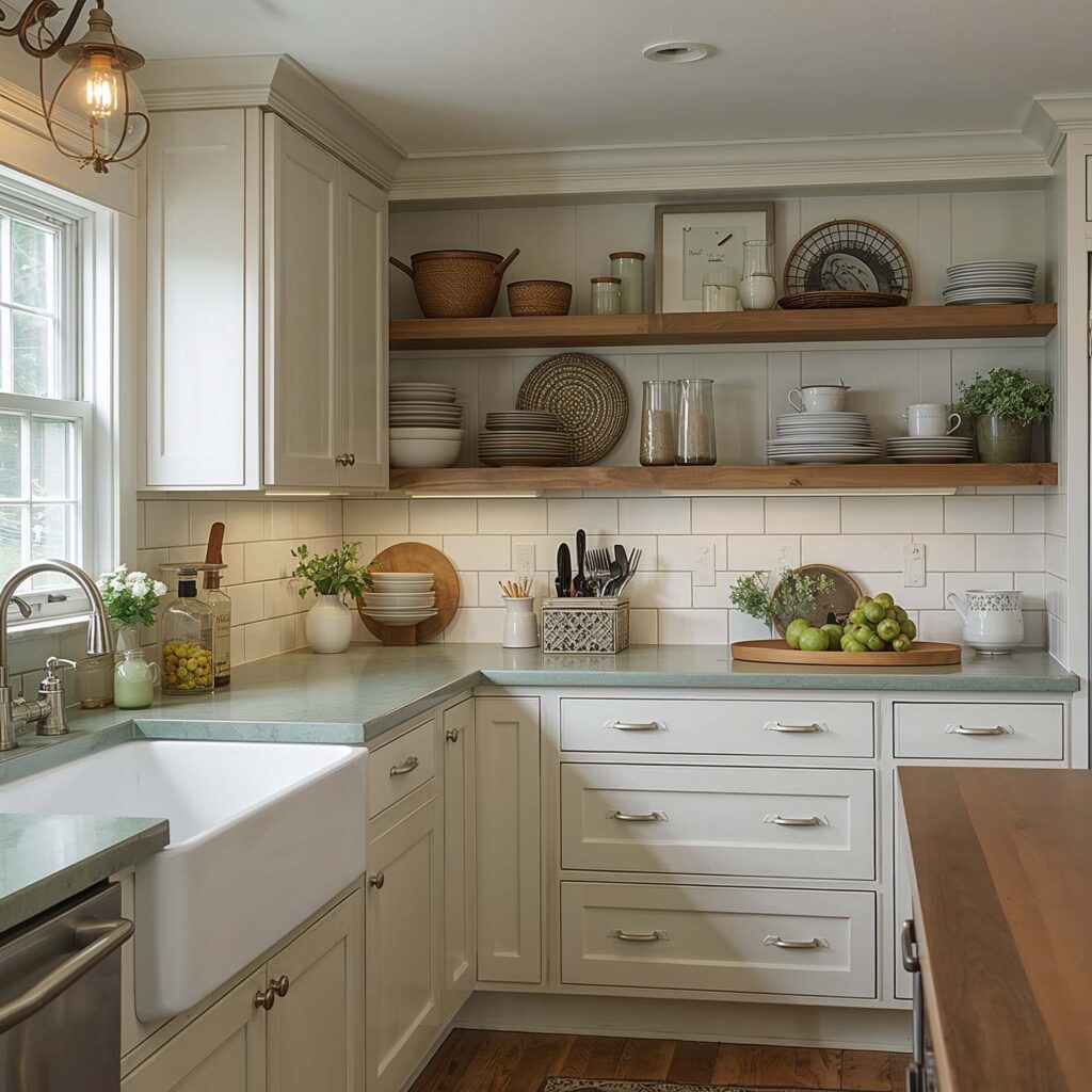 White shaker cabinets with sage or olive countertops? Chef’s kiss. The combination brings contemporary color to traditional style without losing that cozy farmhouse charm. I’ve seen this combo work beautifully with both genuine vintage cabinets and new builds going for that farmhouse aesthetic.