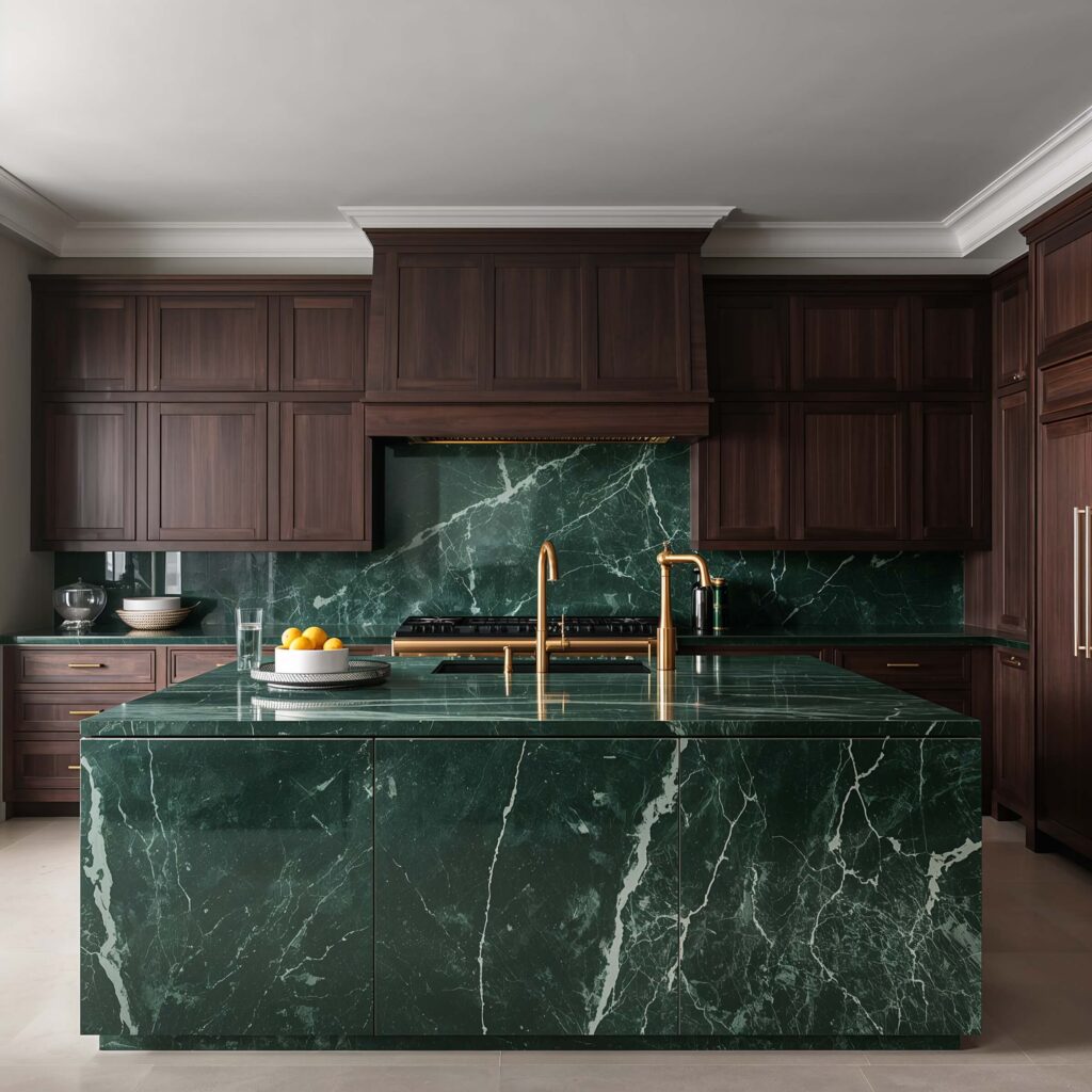 Can we talk about forest green marble for a second? Because wow. If you want countertops that look like they belong in a luxury mountain lodge, this is your answer.