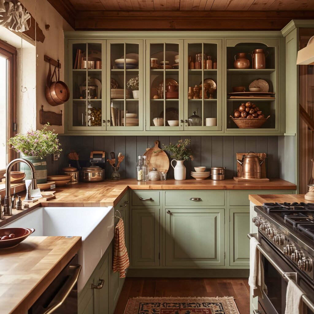 Green countertops with farmhouse cabinets create this perfect modern-meets-rustic vibe that feels both fresh and timeless.