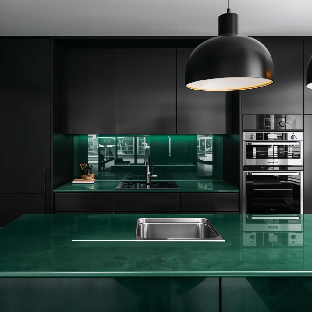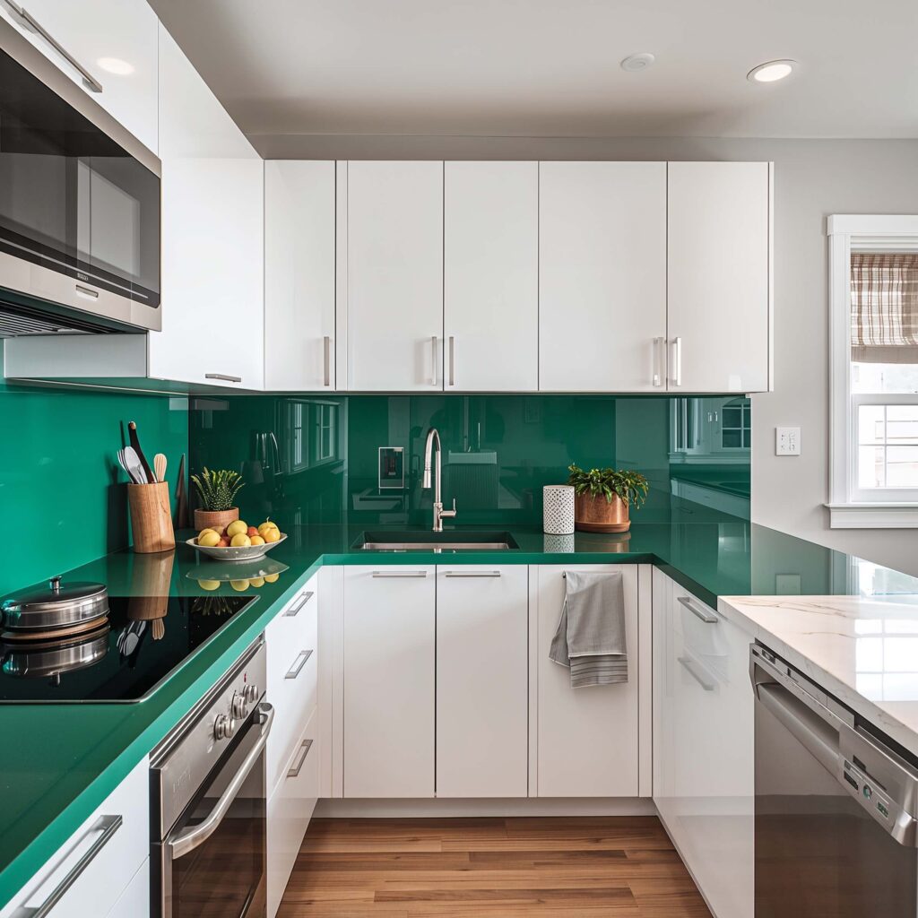 The reflection from glossy green countertops actually makes kitchens feel larger and brighter. It’s like having mirrors that happen to be gorgeous green.