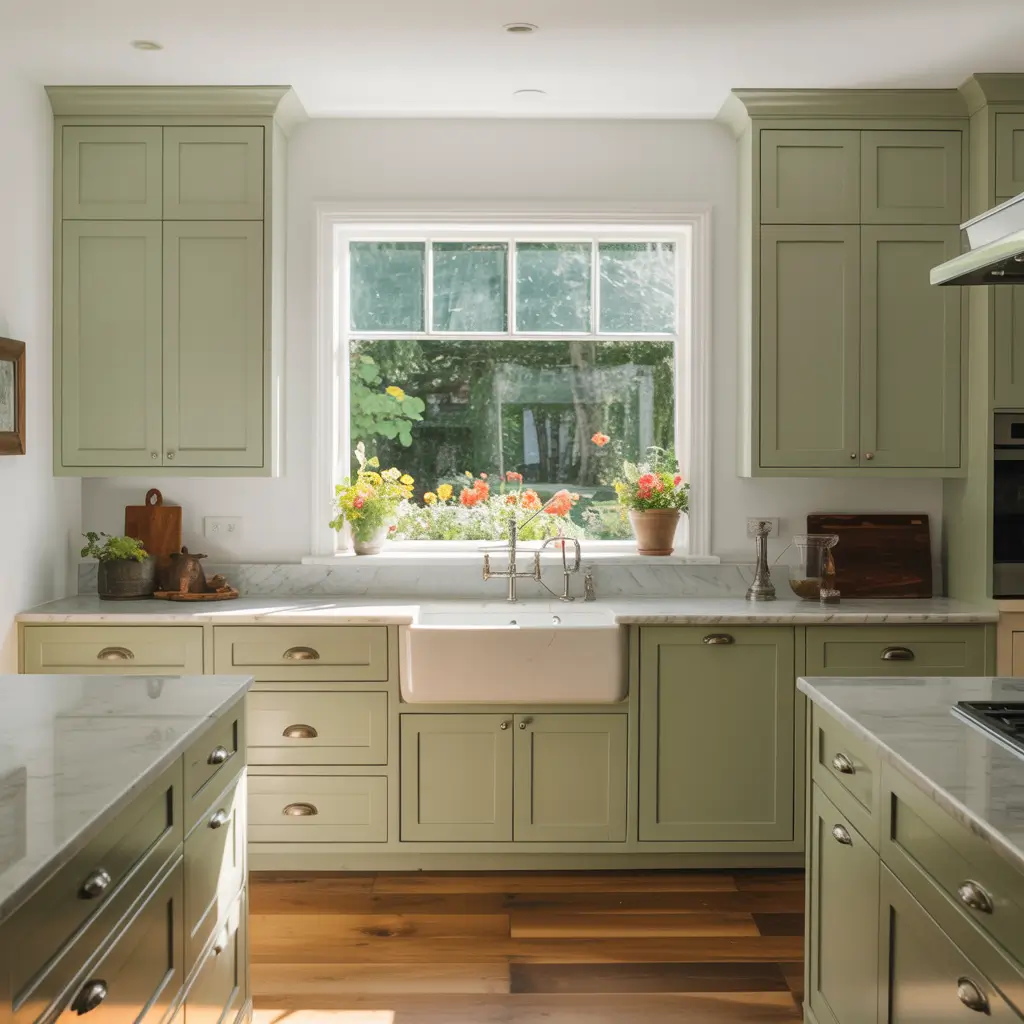 Sage green adapts to any kitchen size or style. In small kitchens, it adds color without overwhelming. In large spaces, it creates intimacy. North-facing kitchens benefit from sage’s warmth, while south-facing rooms love how it cools things down.
