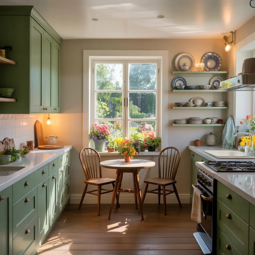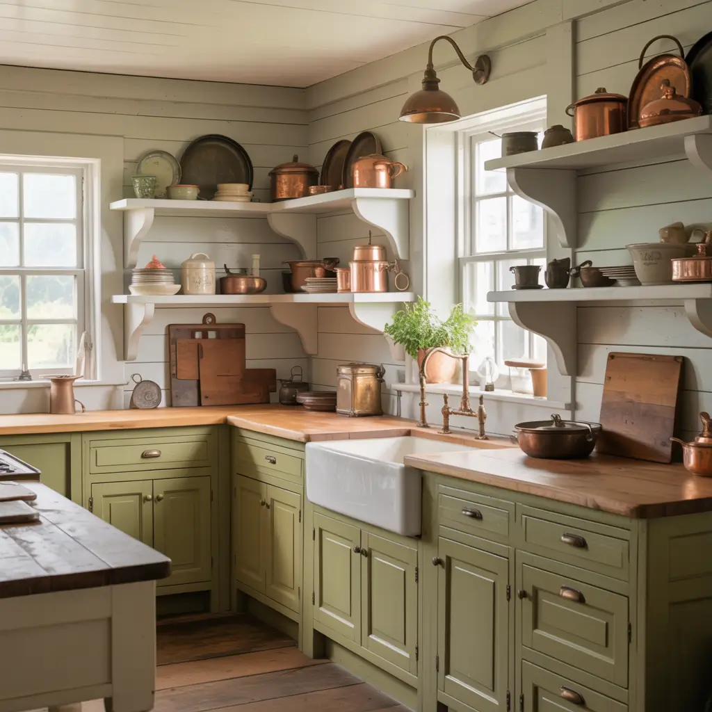 These aren’t bright or cheerful greens—they’re complex, sophisticated colors that change with lighting and actually get better with age as your kitchen develops its own patina.