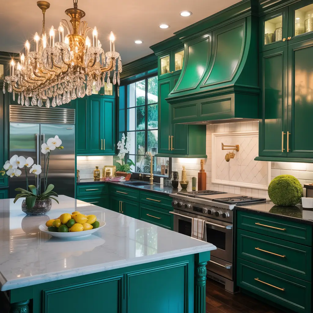 Emerald green in a matte finish screams luxury louder than any marble ever could. This jewel tone brings drama and sophistication that transforms ordinary kitchens into something extraordinary.