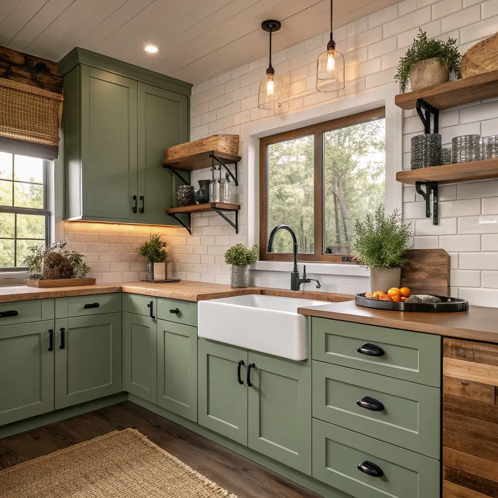 10. Earthy Green Kitchen Cabinets with Wood Accents