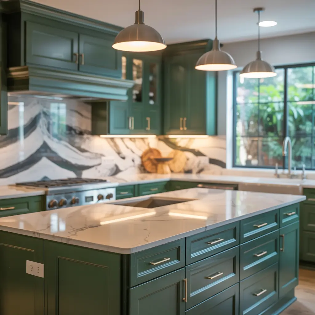 Not all marble works with green cabinets. Calacatta with its warm veining pairs beautifully with sage or olive. Carrara’s cooler tones work with mint or pale green. Dramatic black-veined options like Nero Marquina create stunning contrast with any green.