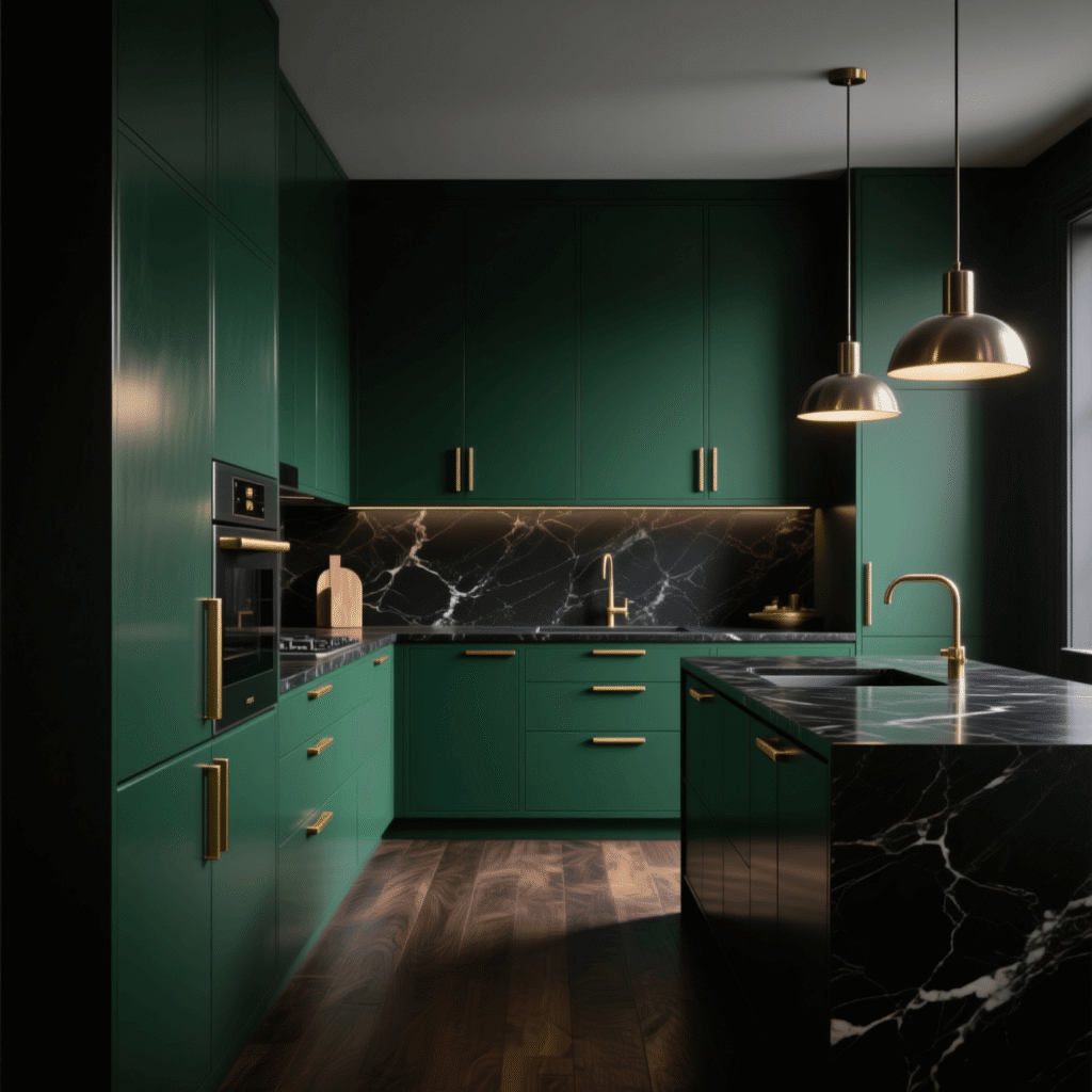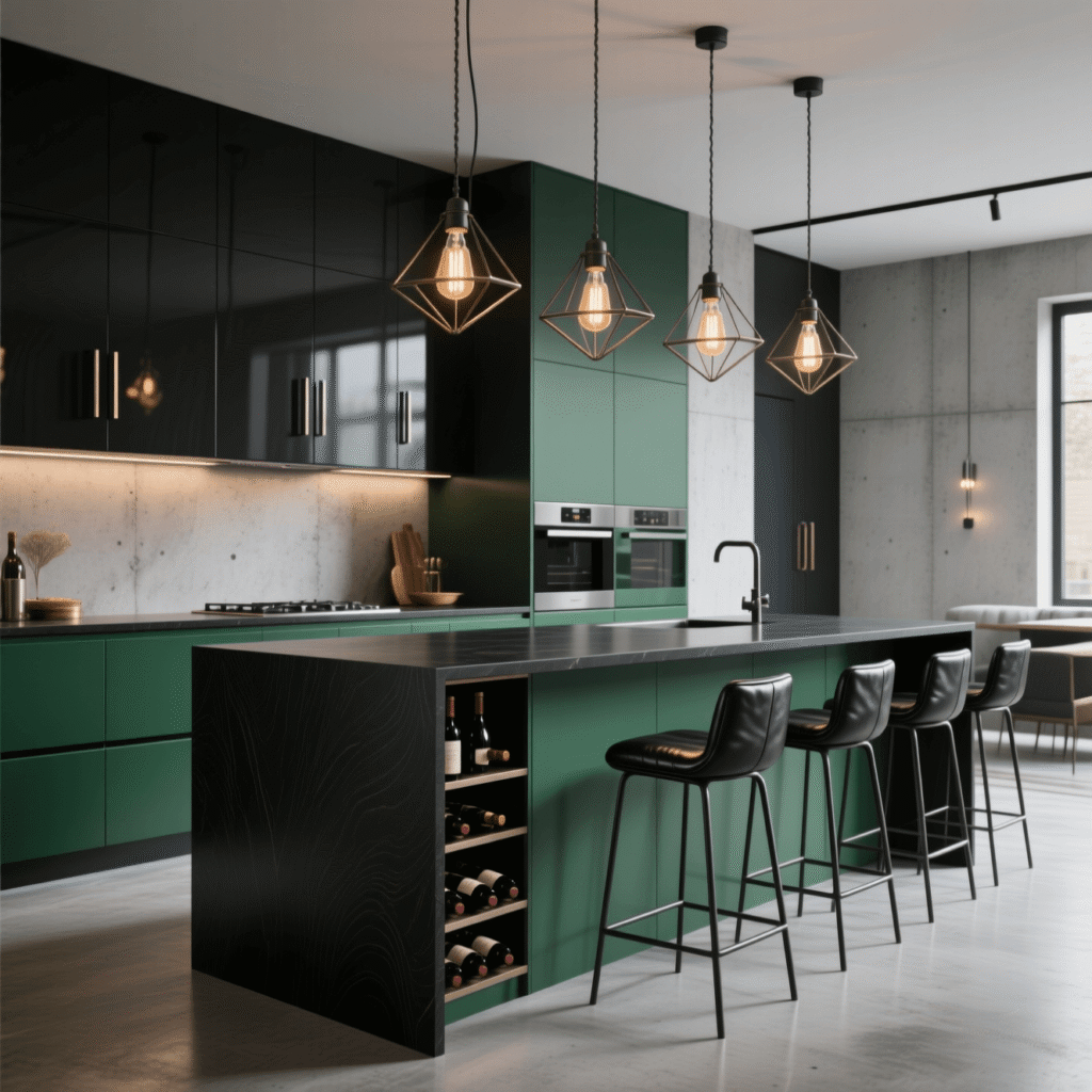 The trick with green and black lies in balance and contrast. I usually suggest green upper cabinets with black lowers, or a green island with black perimeter cabinets. This creates visual weight at the bottom while keeping things lighter up top.
