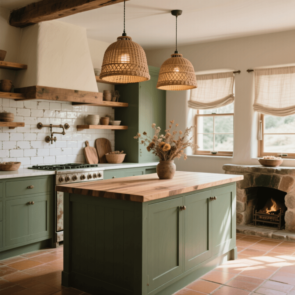 The magic happens when you pair olive green with natural wood. I’m talking oak shelving, walnut cutting boards, and maybe a reclaimed wood island top. This combo creates depth and warmth that synthetic materials just can’t match.