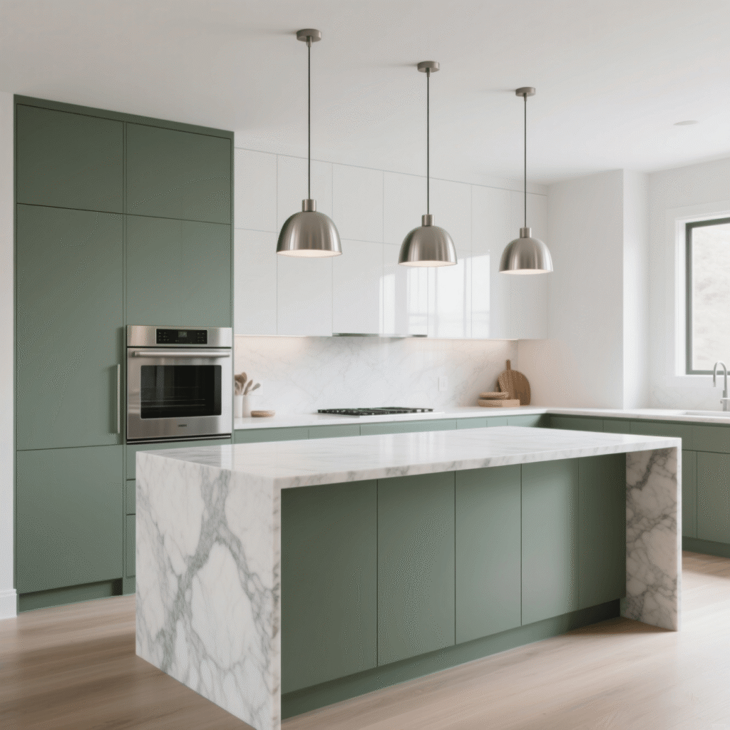 The veining pattern matters too. Subtle veining feels calm while dramatic veining adds energy to your green kitchen.