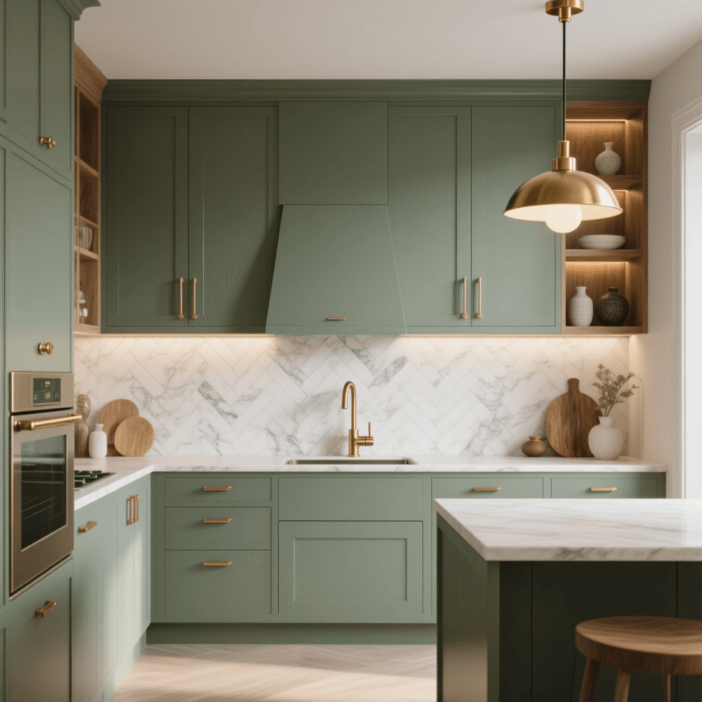 Gold elevates any green from nice to knockout. Whether it’s hardware, lighting, or faucets, gold touches make green cabinets look intentionally designed rather than randomly painted.