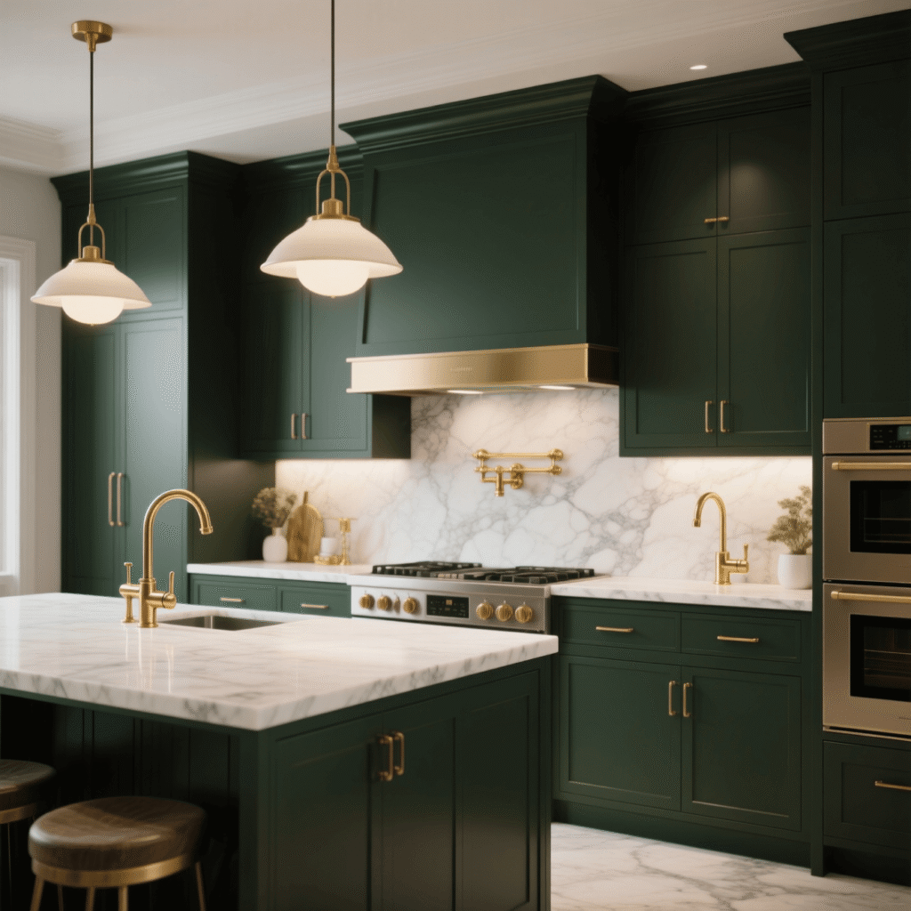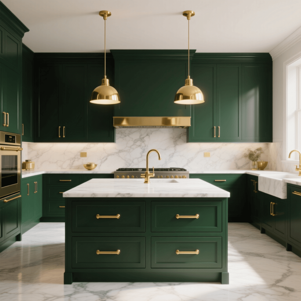 Emerald green loves luxury materials. Marble countertops, gold hardware, and crystal lighting elevate the whole vibe to another level. It’s like your kitchen suddenly belongs in a fancy magazine spread.