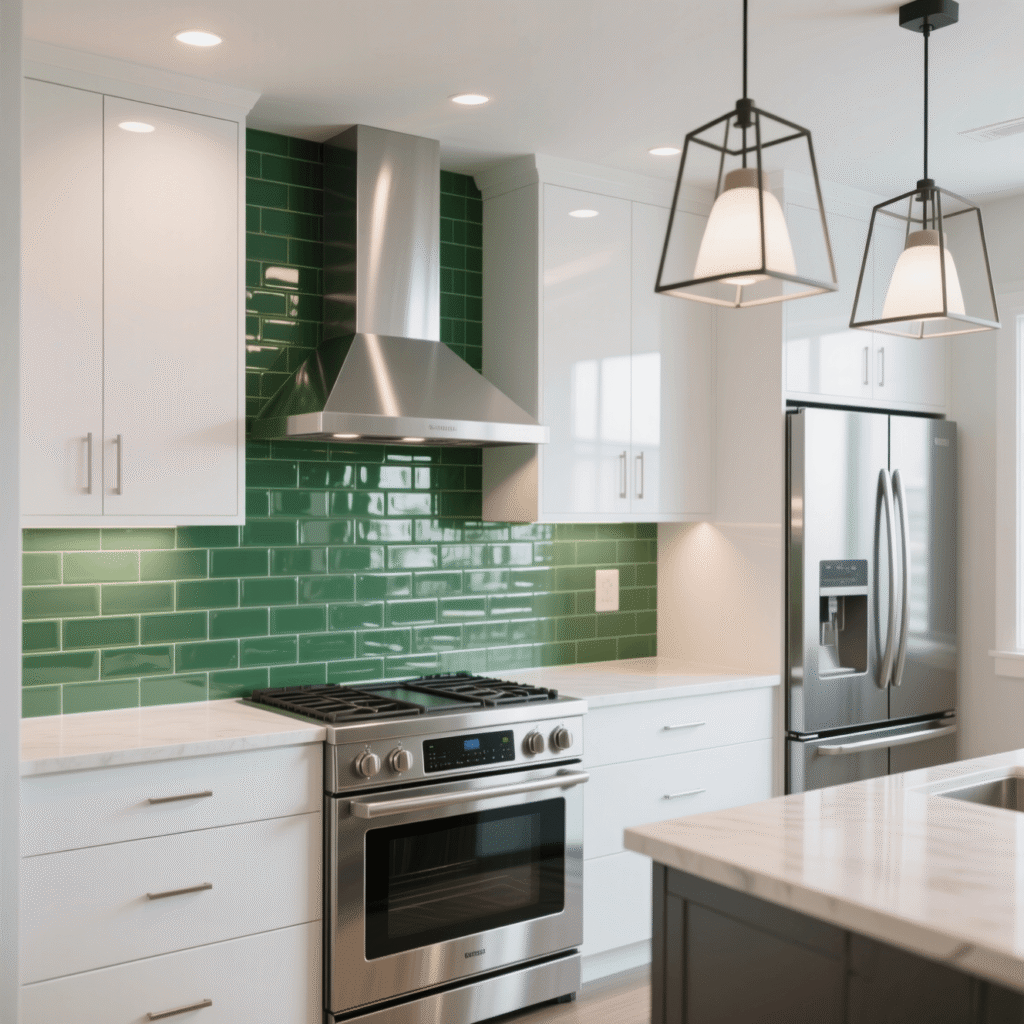 Who says cabinets get all the green glory? A green backsplash adds color without commitment – perfect if you’re not ready for green cabinets.