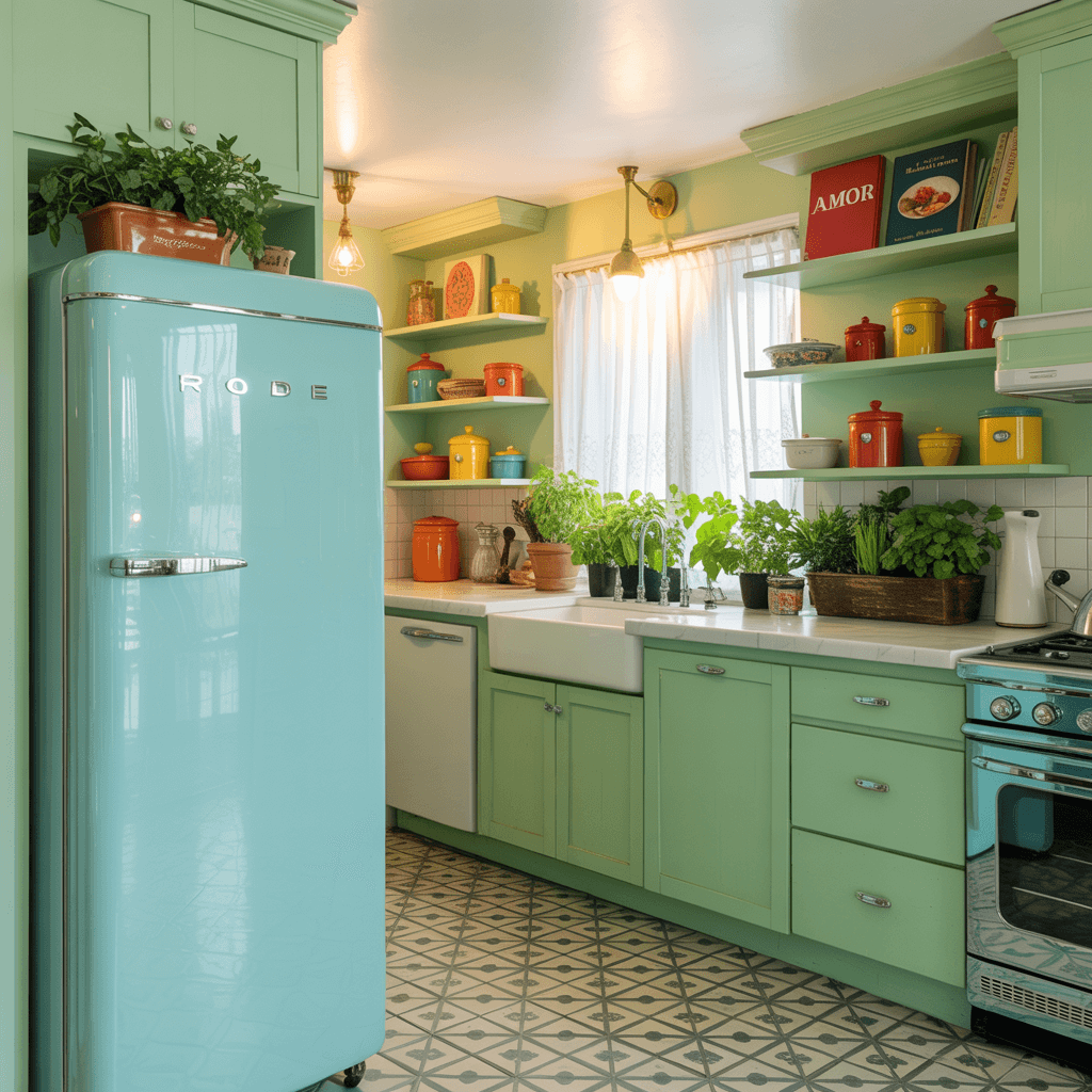 Real vintage appeal comes from the details. Original 1950s mint green appliances (or modern reproductions) become statement pieces. Checkerboard floors, chrome fixtures, and retro bar stools complete the look.