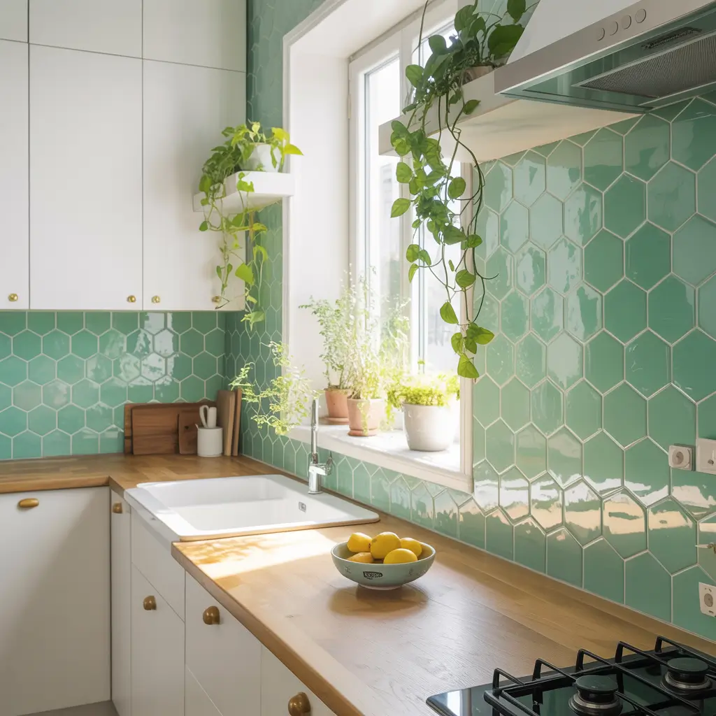 2. Mint Green Hexagon Tiles Kitchen