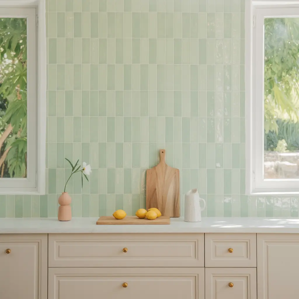 Soft pastel greens combined with geometric tile shapes create kitchens that feel fresh, modern, and effortlessly stylish.