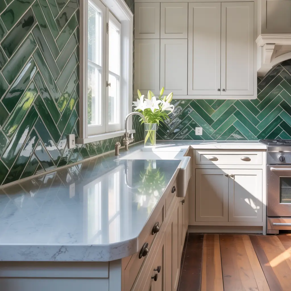 Green herringbone tiles work brilliantly as full-height backsplashes extending from countertop to ceiling. The pattern’s vertical emphasis enhances this application beautifully.
