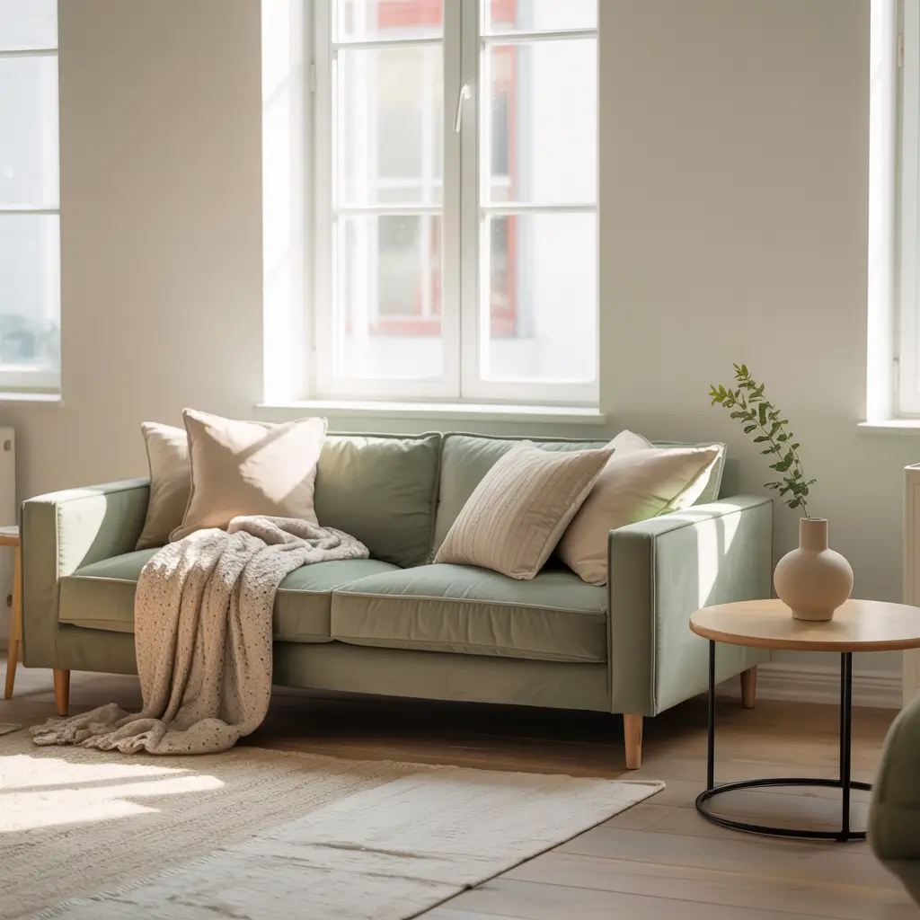 Traditional Scandinavian design can feel a bit monotonous with endless white, gray, and beige. A green sofa adds life without disrupting the calm, minimalist vibe. I chose mint green specifically—pale enough to maintain Scandi’s light, airy feeling but definitely green enough to register as color.