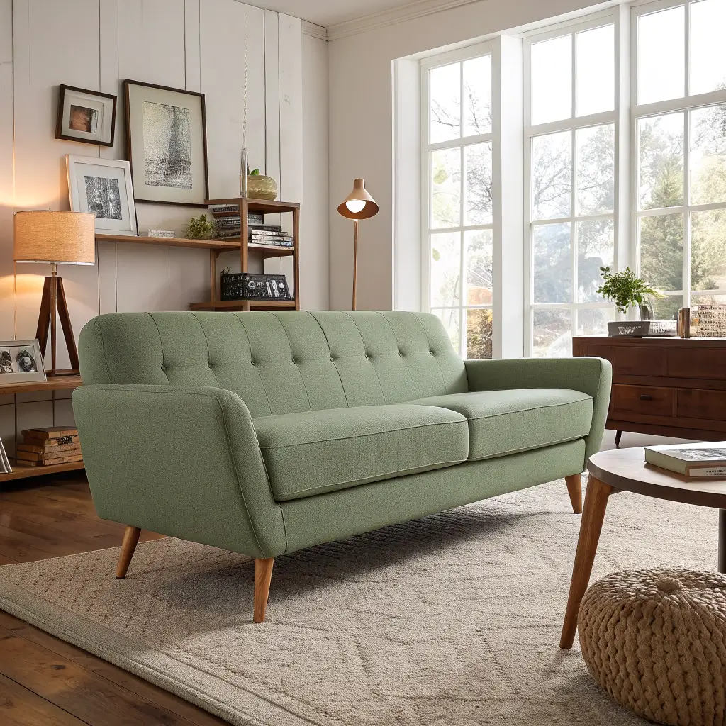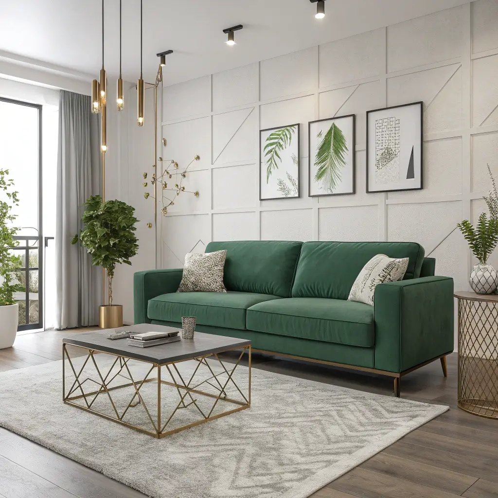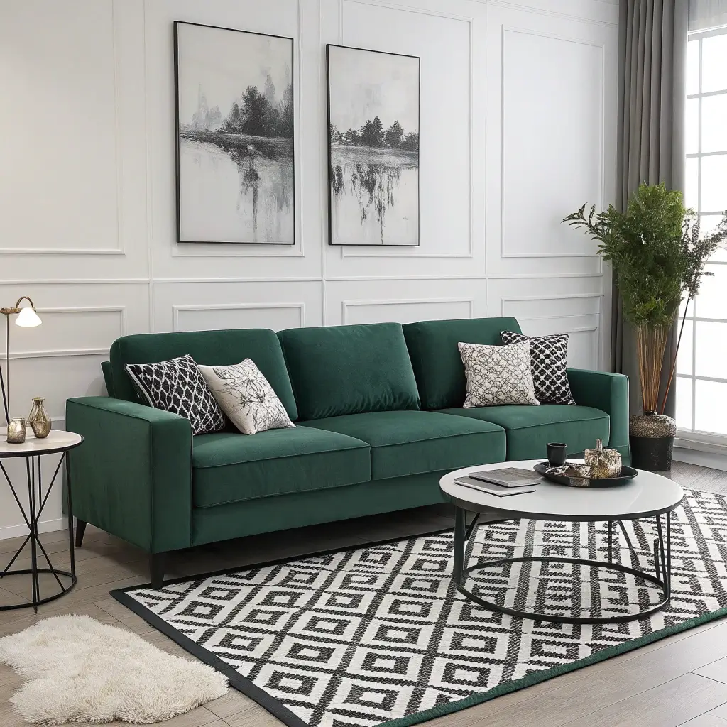 Modern spaces absolutely love green sofas, especially when balanced with neutral accents. I redesigned my friend’s living room using this exact combo—her forest green mid-century modern sofa against white walls with beige and gray accessories—and the result looks like a West Elm catalog shoot.