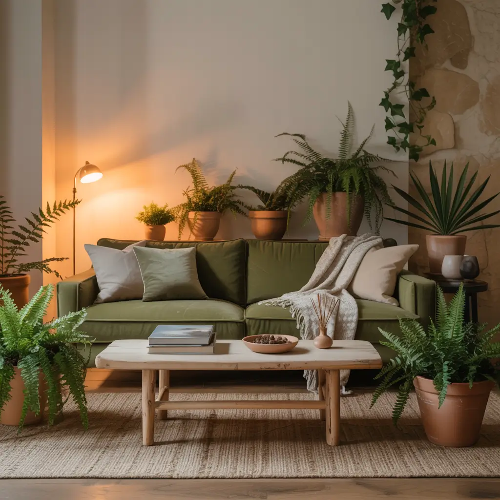 Boho demands layers, and green sofas handle it beautifully. On my sister’s olive sofa, we piled: