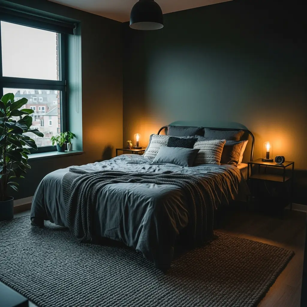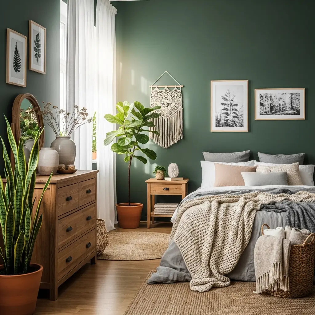 Forest green walls paired with natural accents create an outdoor retreat indoors. This combination makes me feel like I’m sleeping in a luxury treehouse – grounded, peaceful, and connected to nature.