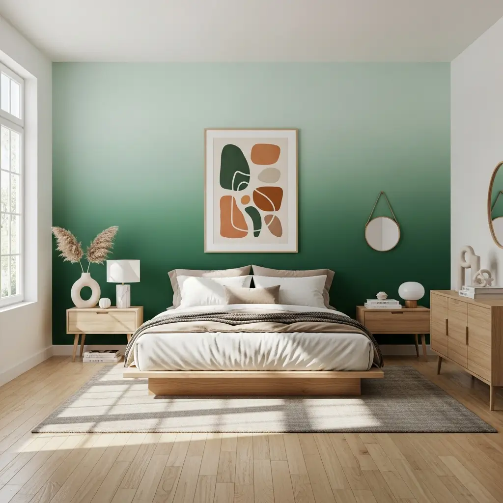 Want something unique? A green ombre wall creates artistic impact that plain paint can’t achieve. This gradient technique, fading from dark to light green, turns your wall into a work of art.