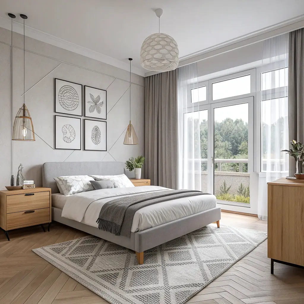 Natural wood plays a crucial role in Scandinavian grey and white bedrooms. It prevents the space from feeling cold or sterile while adding organic texture that synthetic materials can’t match.