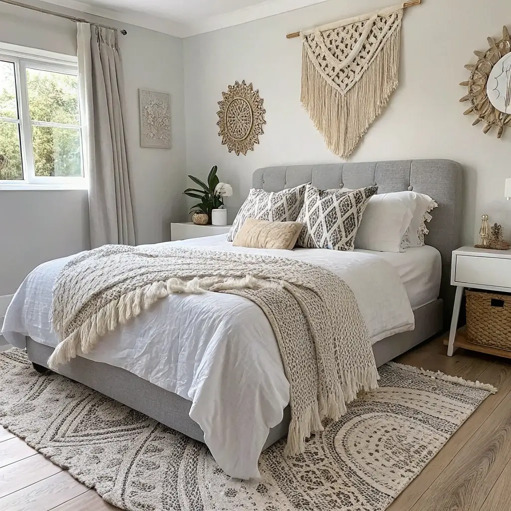 2. Modern Grey and White Boho Bedroom