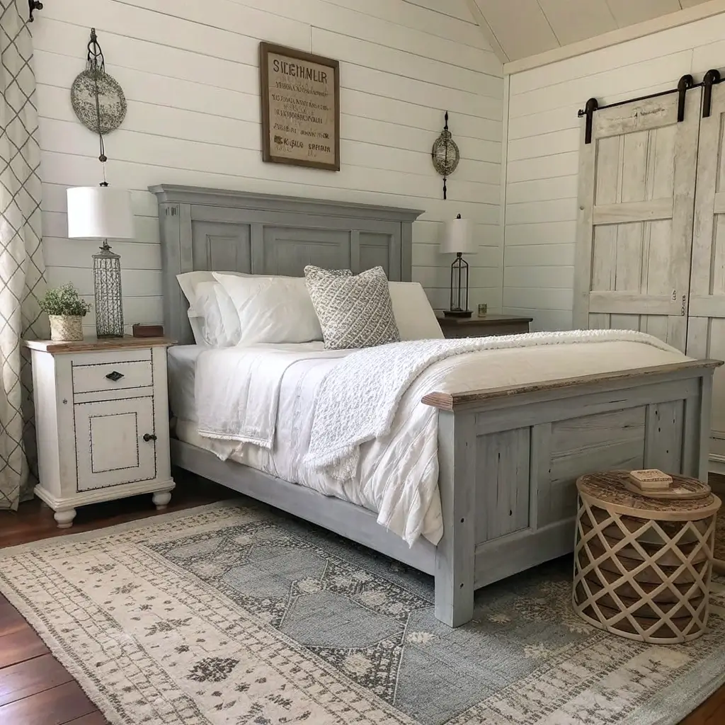 Farmhouse style brings warmth, character, and that coveted “lived-in” feeling to grey and white bedroom decor. This approach combines rustic textures with sophisticated neutrals for spaces that feel both cozy and refined.