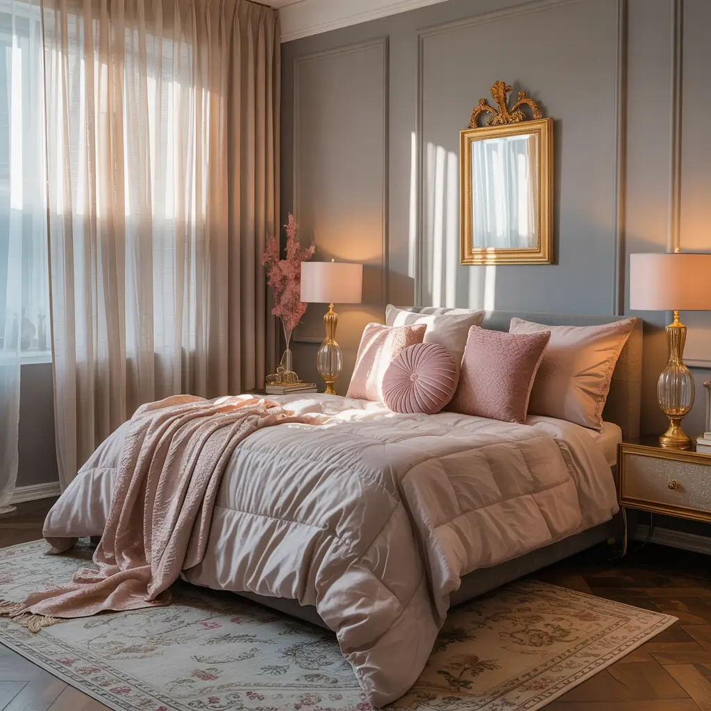 Grey and blush bedrooms combine sophistication with softness. This trendy pairing brings warmth to grey without venturing into overly feminine territory.