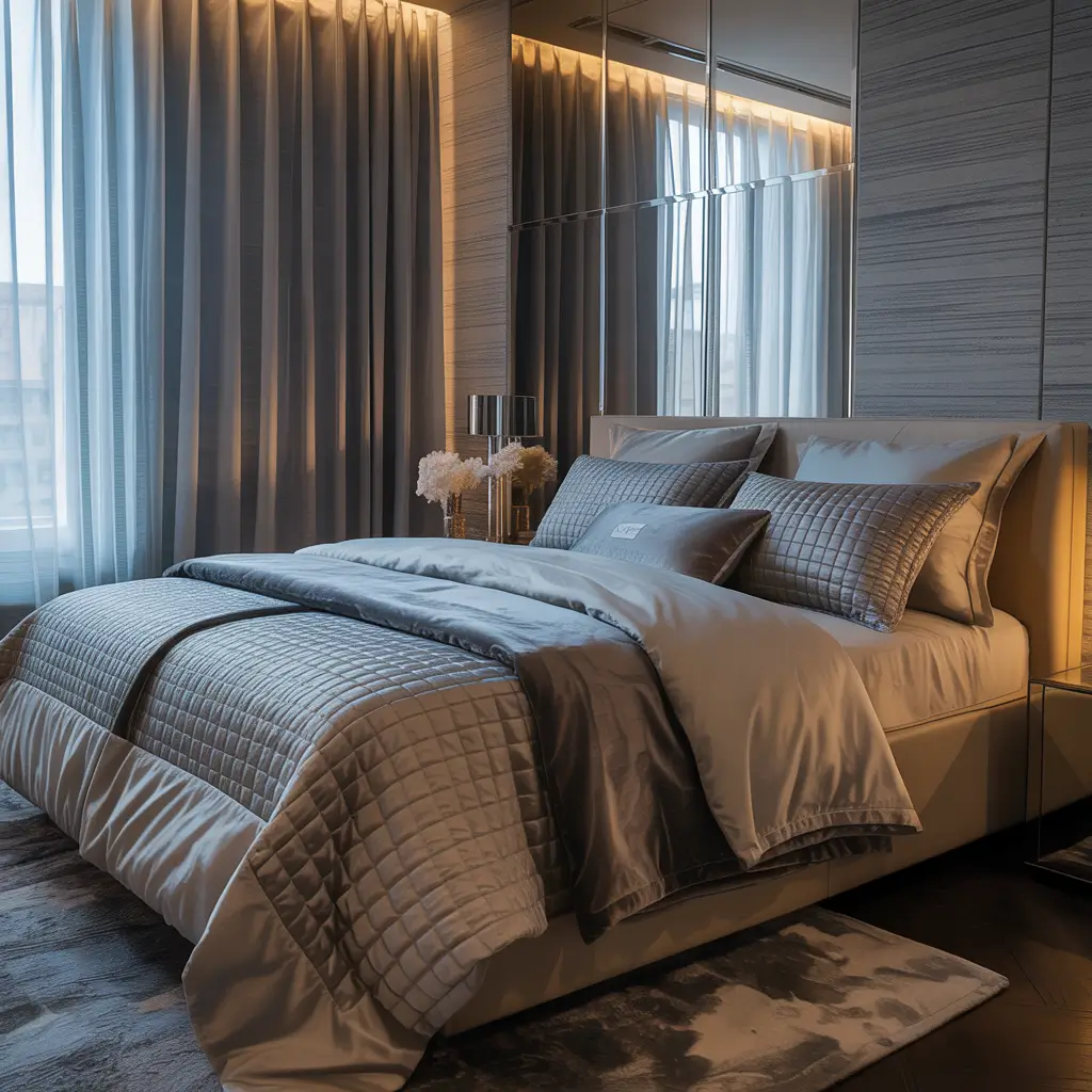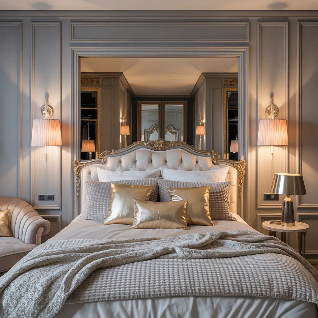 Glamorous grey bedrooms combine understated color with show-stopping shine. This style proves grey can be anything but dull when paired with metallics.